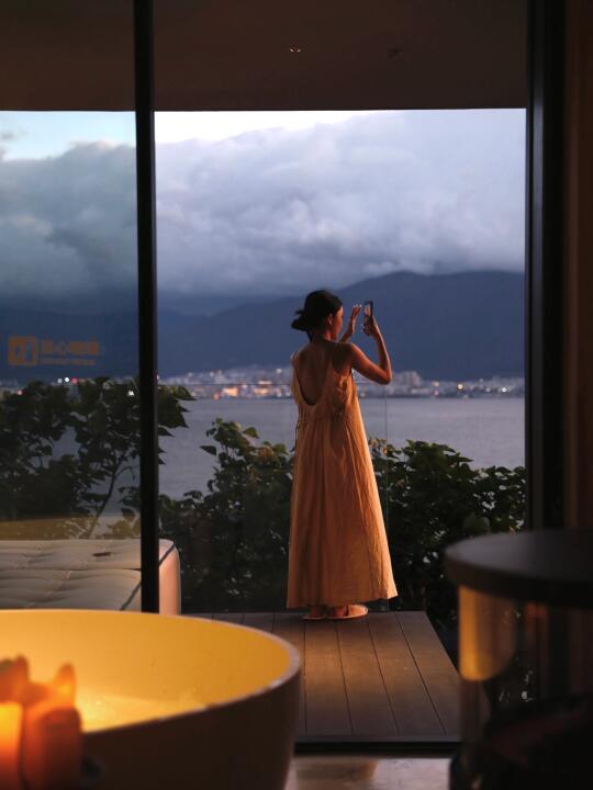 暮色四合时,在房间或露台上欣赏洱海的日落晚霞