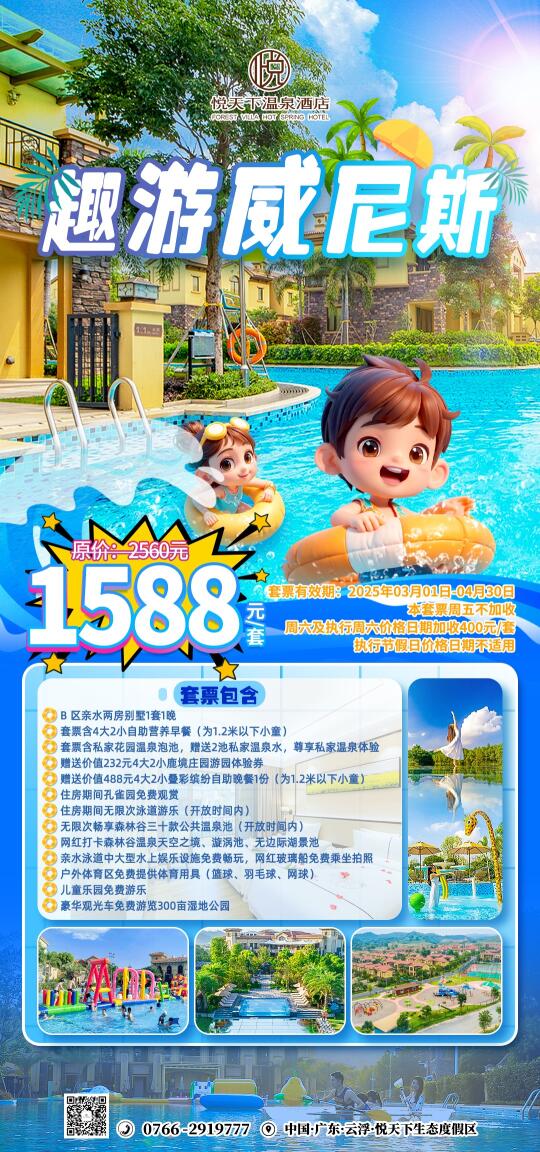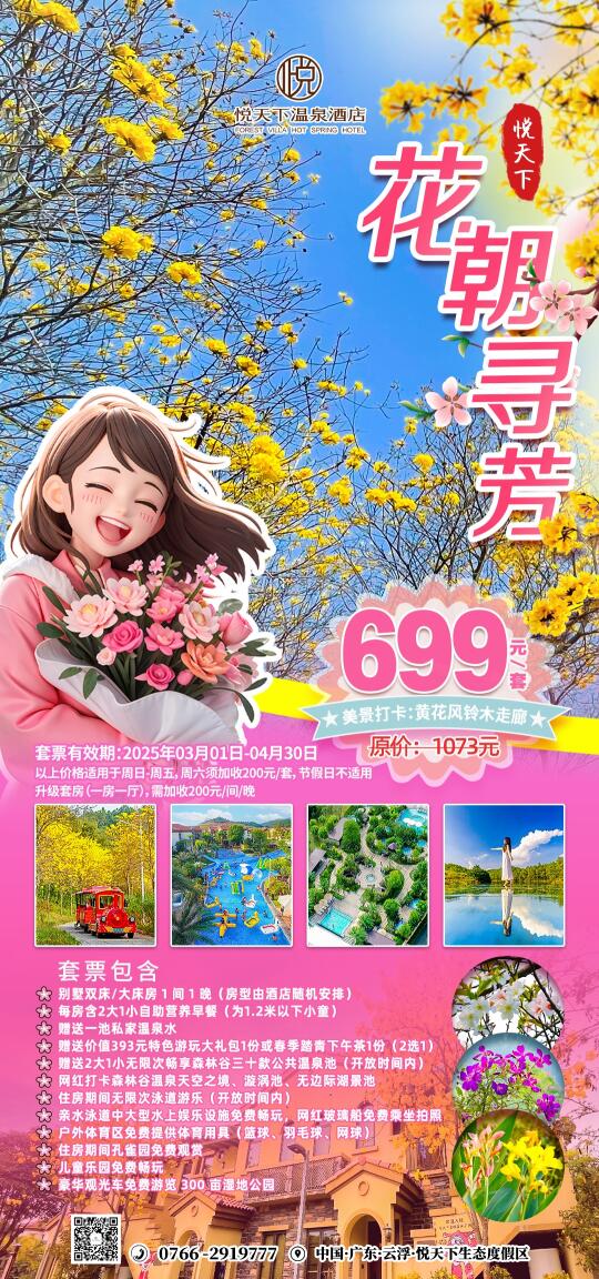 这个春天,如果你想逃离城市的喧嚣,寻找一处集赏景、踏青、泡汤于一体的治愈天堂,那云浮悦天下温泉酒店绝对能承包你的所有期待! 🌸 踏青赏花,与自然撞个满怀 酒店坐落在9000亩森林秘境中,春日里绿意盎然,湿地公园的7000㎡大草坪是野餐放风筝的绝佳地!沿着徒步道或单车绿道漫游,呼吸着负氧离子爆表的空气,偶遇野花点缀的小径,仿佛闯入了绿野仙踪的童话世界 3.1-4.30期间还能享受「花朝寻芳」优惠活动,原价1073元的温泉酒店套票仅需699元,更多优惠福利详情查看海报哦~ ♨️ 私享温泉,泡进春天的温柔里 谁说泡汤是冬天的专利?春暖花开时,在私家温泉泡池里舒展身心才是极致享受!酒店的温泉水富含偏硅酸、氡等微量元素,不仅能赶走春困,还能让肌肤水润透亮~🌺 🌊 威尼斯泳道,玩水也要仪式感 数公里长的亲水泳道环绕别墅群,推门直接跳入!白天在泳道划透明玻璃船,夜晚灯光亮起时,泳道化身蓝色丝带,随手一拍就是ins风~带娃的宝爸宝妈们别错过儿童乐园和生态小湖,滑梯、秋千、萌宠互动,小朋友玩到不想走!3.1-4.30期间还有「趣游威尼斯」优惠活动,B区亲水两房别墅温泉套餐超值优惠价1588元(原价2560元),更多优惠福利信息详见海报。 🏡酒店信息 📍酒店:悦天下温泉酒店 📍地址:云浮市新兴县水台镇悦天下生态度假区 这个春天,来悦天下拥抱森林、温泉与花海,把日子过成诗吧!💐