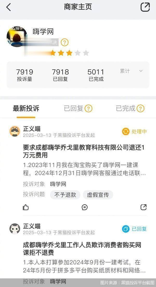 北京商报记者在黑猫投诉平台上看到,有关嗨学网的累计投诉量达到7919个,截至2025年3月13日的近30天累计投诉量为146个,投诉的问题主要集中在虚假宣传、诱导消费、不予退款等方面。