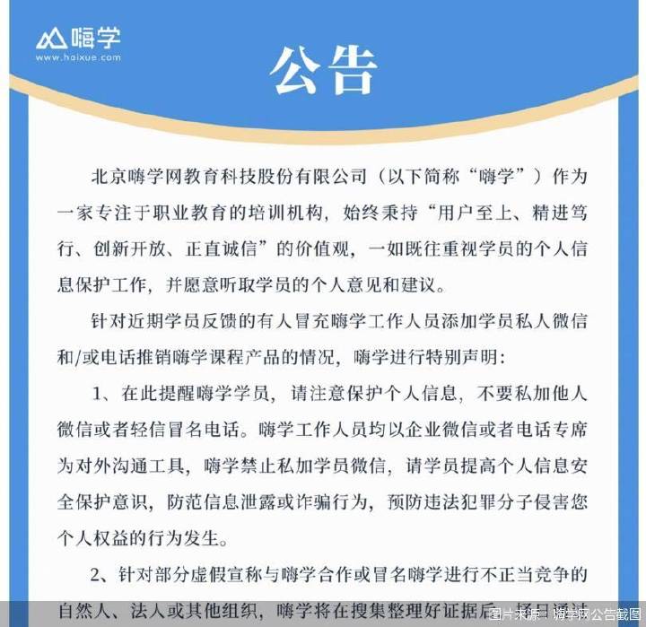 这两个细节为何值得关注?原因是在2024年9月14日嗨学网曾发布一则公告。公告称,近期学员反馈的有人冒充嗨学工作人员添加学员私人微信和/或电话推销嗨学课程产品的情况,嗨学进行特别声明:在此提醒嗨学学员,请注意保护个人信息,不要私加他人微信或者轻信冒名电话。嗨学工作人员均以企业微信或者电话专席为对外沟通工具,嗨学禁止私加学员微信,请学员提高个人信息安全保护意识,防范信息泄露或诈骗行为,预防违法犯罪分子侵害您个人权益的行为发生。