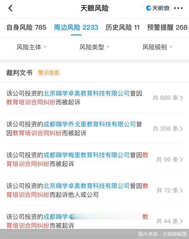 天眼查信息则显示,有大量嗨学网及其100%投资或控制的公司,曾因教育培训合同纠纷而被起诉的裁判文书信息。截至2025年3月13日,嗨学网有431条,北京嗨学卓奥有669条,成都嗨学乔戈里有358条,成都嗨学梅里教育科技有限公司有96条。