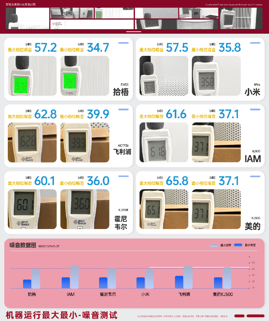 IAM 500F和小米4Pro的噪音表现都较为适中,最低噪音分别为35.8 dB和37.6 dB,最高噪音分别为61.6 dB和57.5 dB。这两款产品的噪音控制良好,适合日常使用,尤其是小米4Pro,虽然在最大噪音上稍高,但在实际使用中的噪音感知较低。