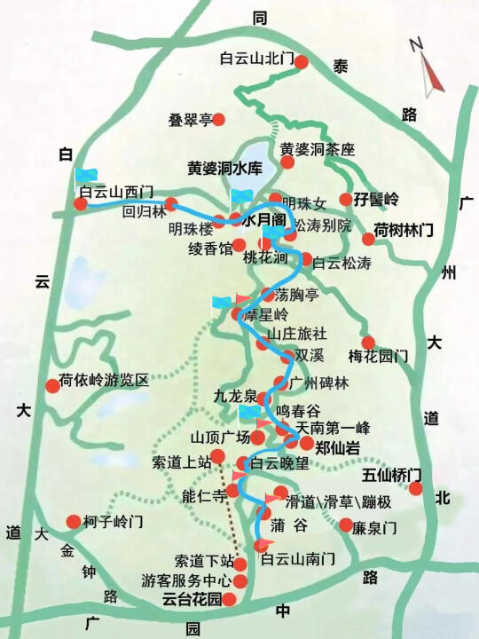 线路二:西门 - 黄婆洞水库 - 桃花涧 - 观光车 - 山顶广场 - 摩星岭 - 南门难度指数⭐⭐⭐(适合多数游客,可灵活调整)