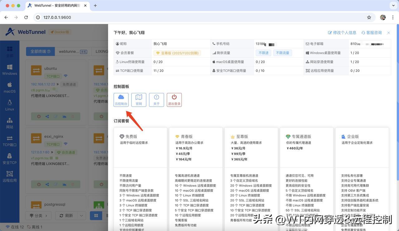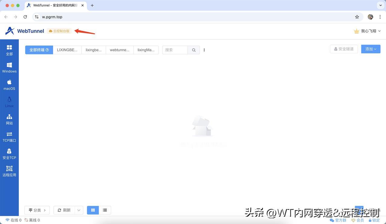 有时候,你是否想过, 在家的沙发上, 轻轻一点, 就能让公司的WebTunnel亮起? 有时候,你是否担心, 远方的连接, 会不会突然消失, 让你辗转难眠? 这些,我们都懂。 所以今天, WebTunnel云控制台, 来了。 在云端, 你可以轻松驾驭每一台终端, 添加、启动、关闭, 甚至更多。 从现在开始, WebTunnel离你更近了, 像呼吸一样自然, 像心跳一样可靠。 来吧, 伸出手, 触摸这触手可及的远方, 感受这份自由与安心。 WebTunnel云控制台, 等你来发现, 等你来体验。