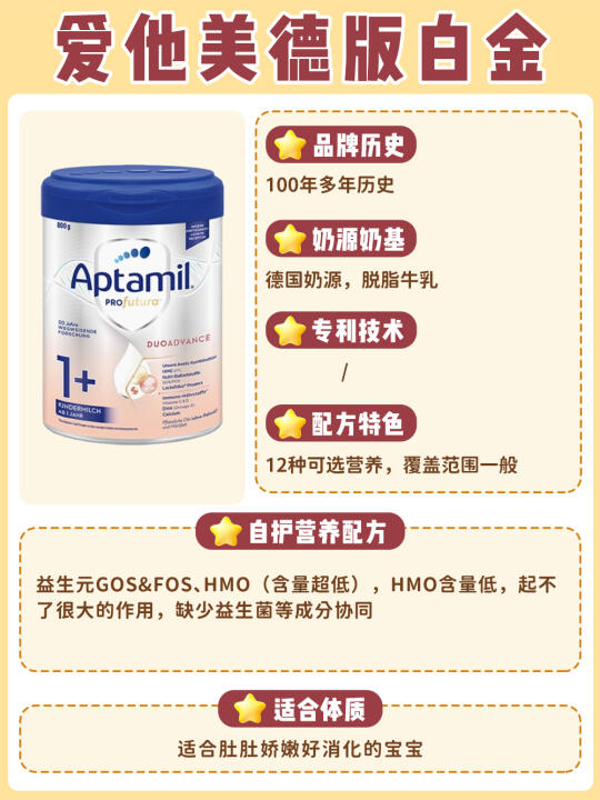 爱他美德版白金:主打益生元GOS&FOS、HMO(含量不高)