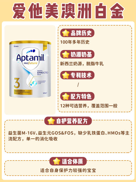 爱他美澳洲白金:主打益生菌M-16V、益生元GOS&FOS