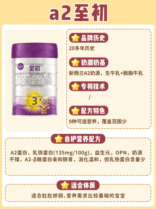 a2至初:主打A2蛋白,乳铁蛋白(135mg/100g),益生元
