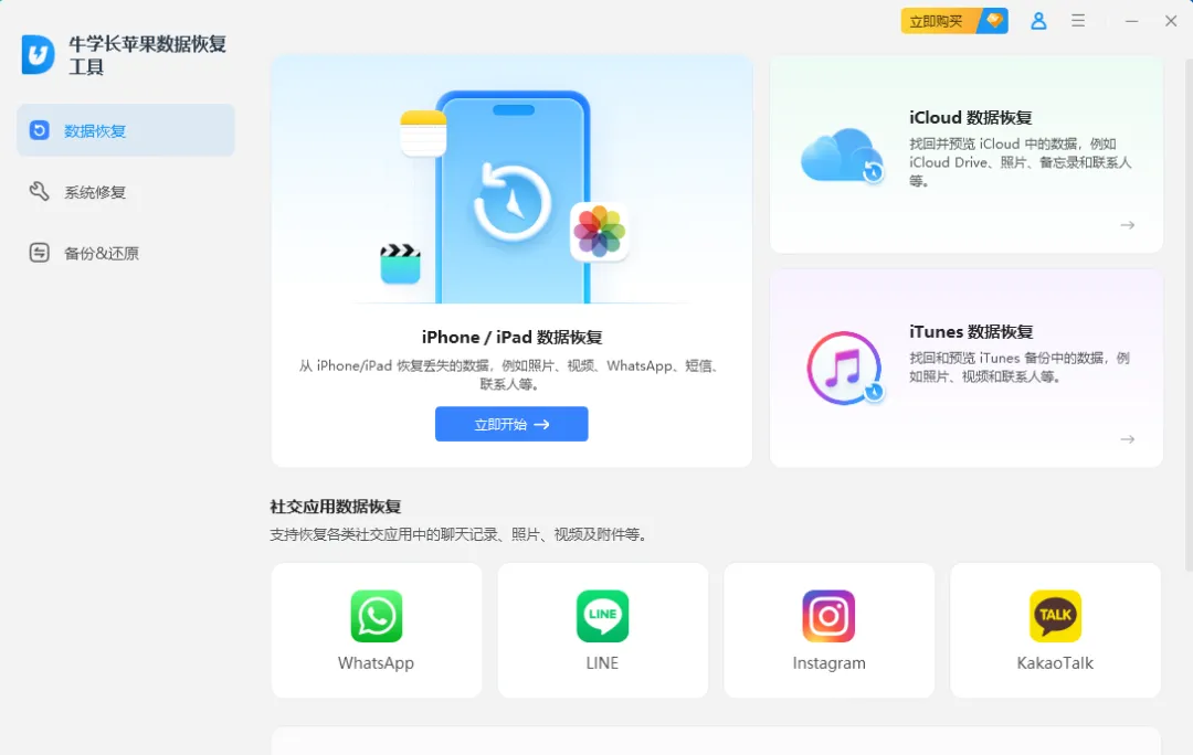 牛学长苹果数据恢复工具是一款专业的iOS设备数据恢复软件,支持恢复iPhone、iPad、iPod Touch等iOS设备上丢失的数据。