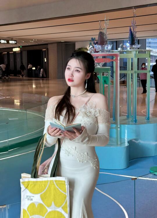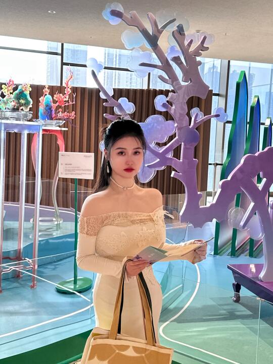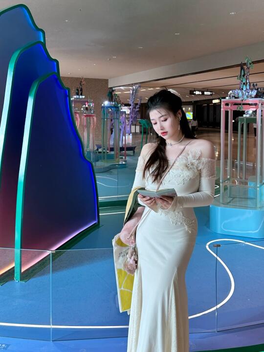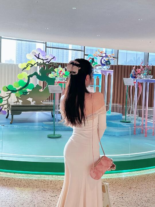 整个展都充满着东方韵味, p1-p4根据这个氛围我选择了一条白色改良旗袍 , 修身的剪裁可以凸显身材曲线,裙子上的花纹与艺术展的意境简直完美融合了