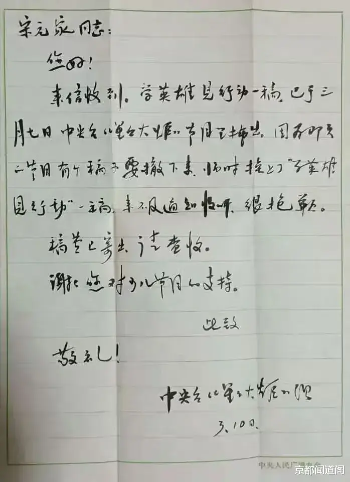 最让我难忘的是1981年的那封毛笔信。当年3月5日学雷锋纪念日临近,黄海深处的海洋岛小学开展了向共产主义战士安业民烈士学习的活动,我撰写了《学英雄见行动》一文,寄给了中央人民广播电台《星星火炬》节目。半个多月后,我收到了一封来自中央台的信件,信封里装着编辑老师用小楷书写的便笺:“稿子已于三月七日播出,因来不及提前通知,深表歉意。”海洋岛是远离大陆的前哨,每三天才有一班船靠岸,等我拿到这封信时,已临近清明节。虽是一封迟到的回信,字里行间却满是温情。