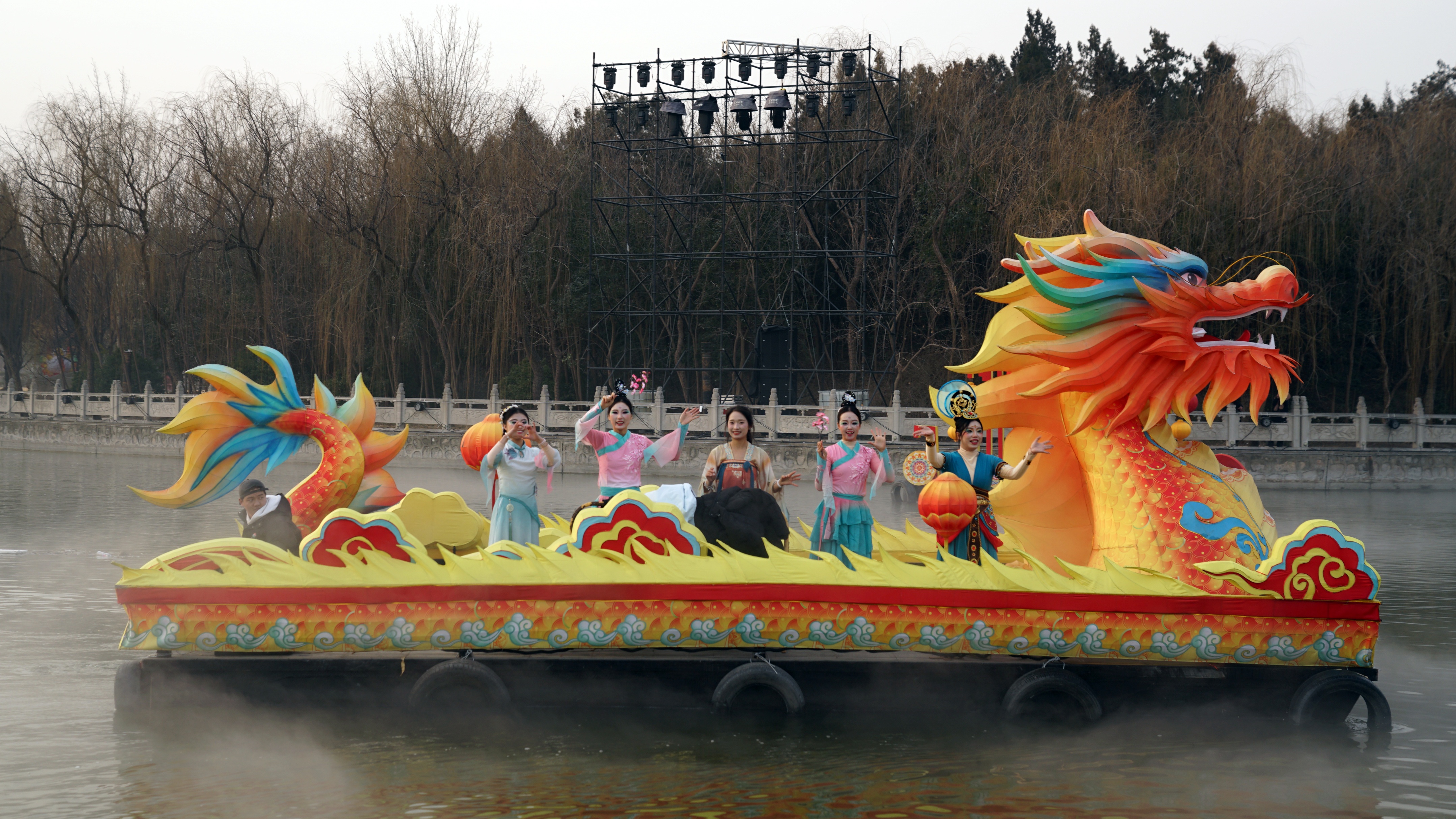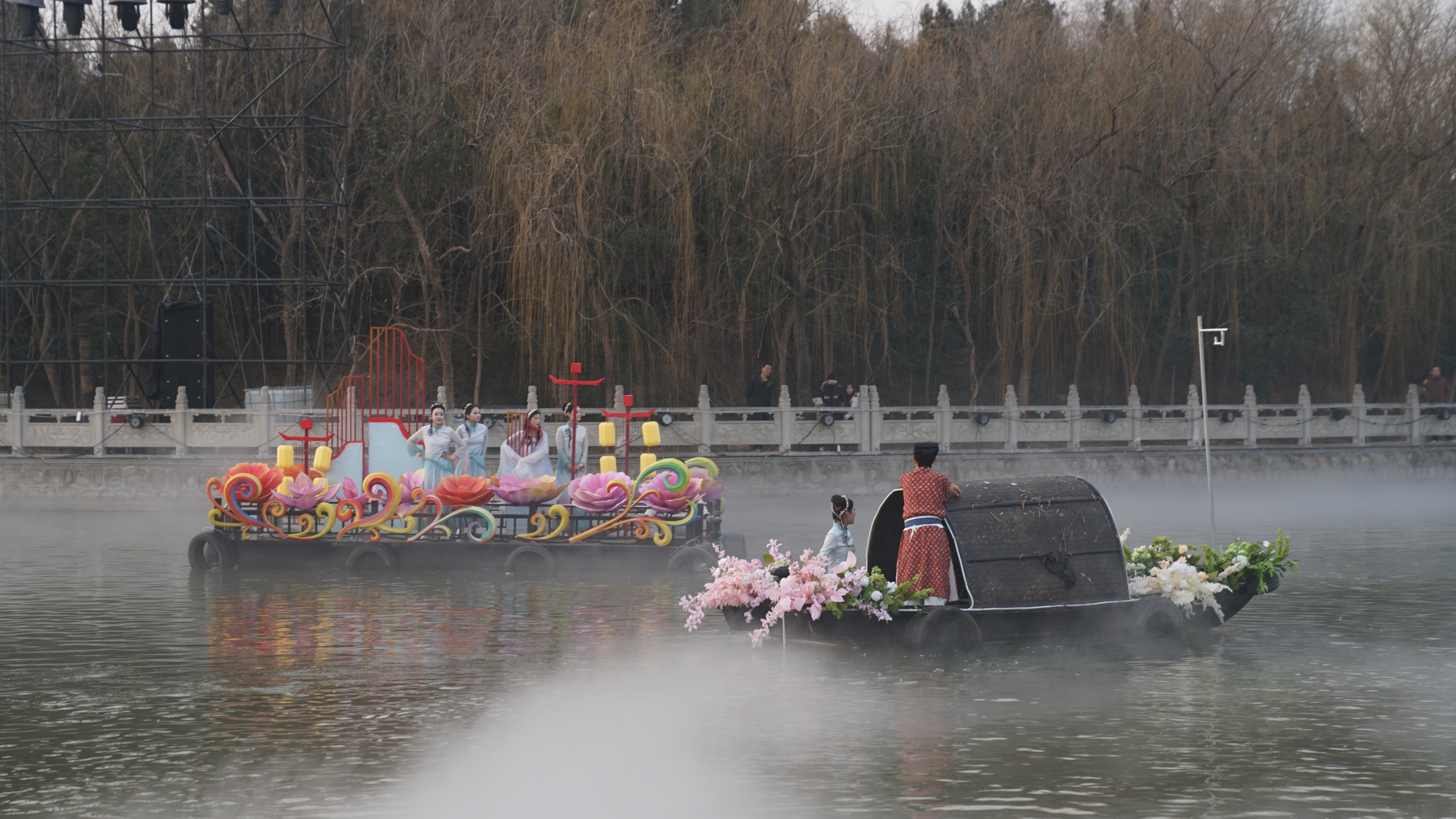 1月28日,彩排表演开始,万众期待的天女散花惊艳上演,仙袂飘飘的舞者空中飞来,漫天花瓣随清风洒落,与烟雨蒙蒙的湖面交织成最浪漫的中式画卷。
