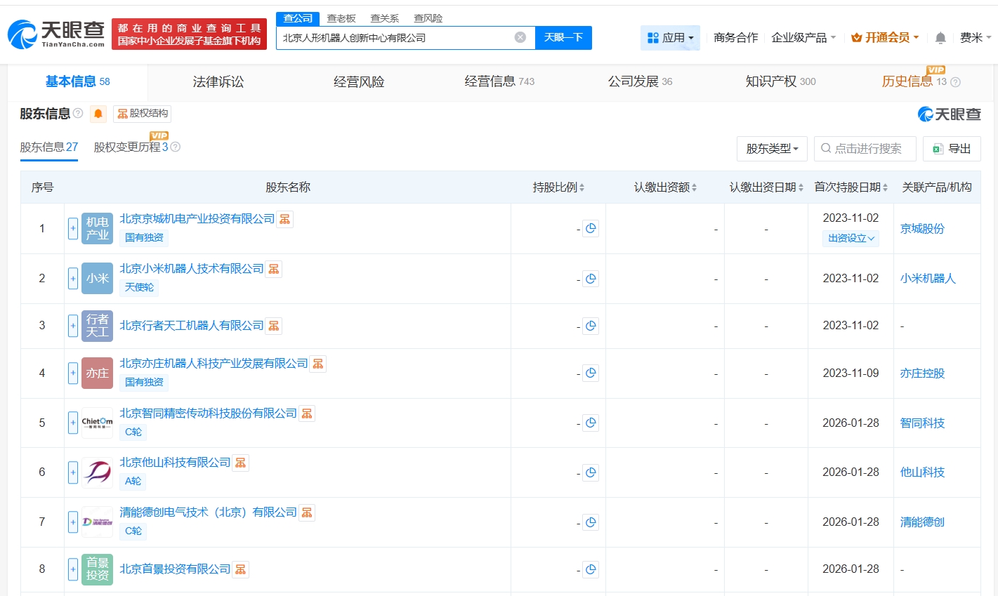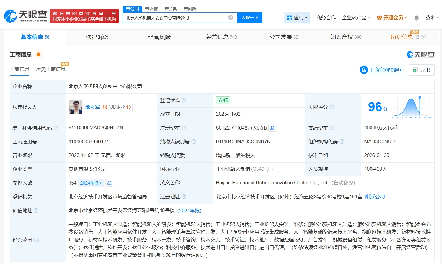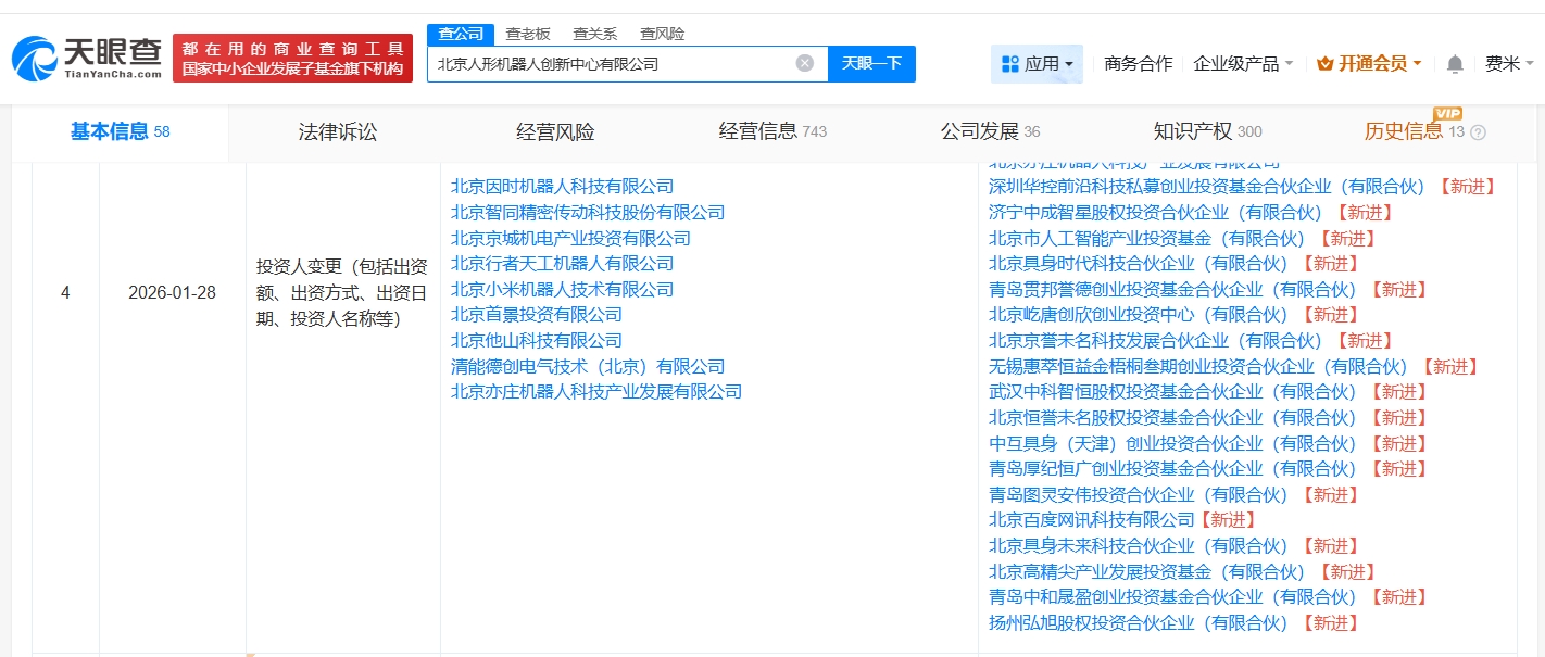 天眼查App显示,近日,北京人形机器人创新中心有限公司发生工商变更,新增北京百度网讯科技有限公司、北京市人工智能产业投资基金(有限合伙)等为股东,同时,注册资本由4.6亿人民币增至约6亿。
