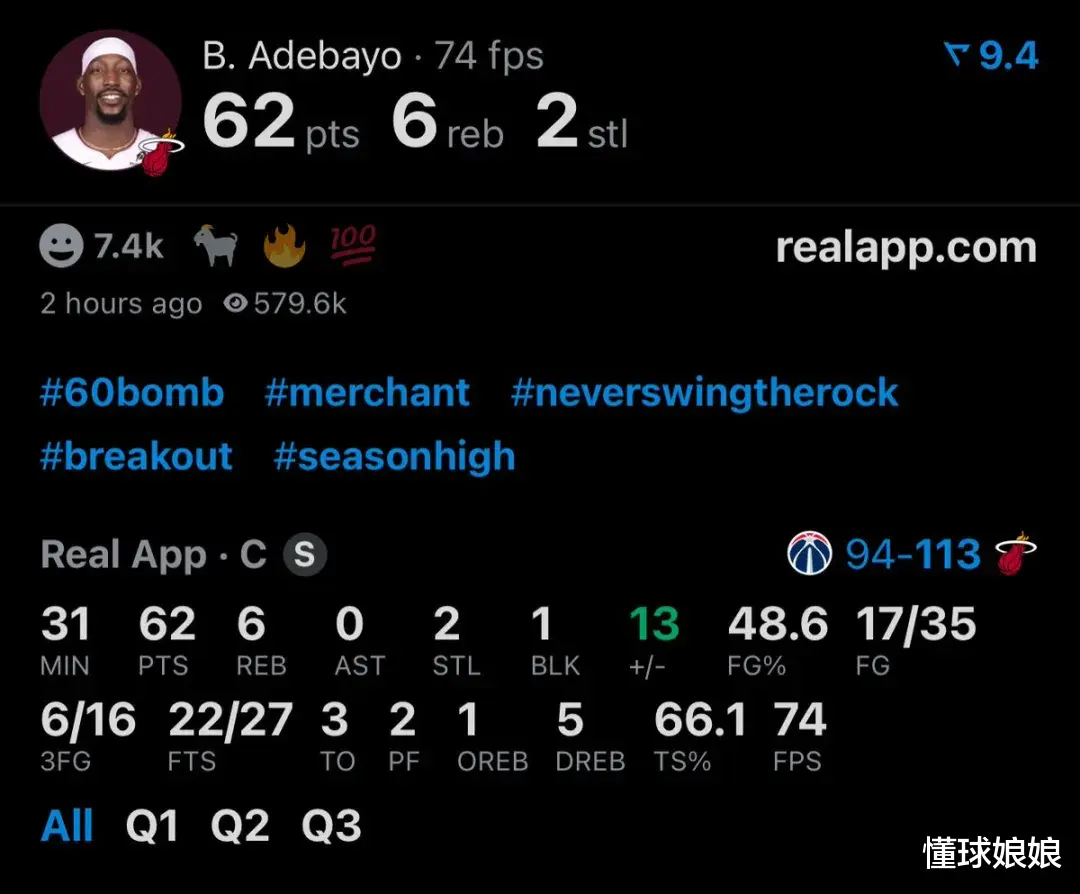 半场结束,阿德巴约的得分已经来到了43分,打破了由詹姆斯创下的队史纪录(37分,下半场)。NBA上半场得分历史纪录是唐斯的44分。三节打完,阿德巴约已经拿到了62分。三节就打破了詹姆斯创下的热火队史单场得分纪录,一个晚上,阿德巴约把詹姆斯在热火留下的队史印记洗了个七七八八。上一个能三节拿到62分的球员,本宫能想到的还是科比呢。