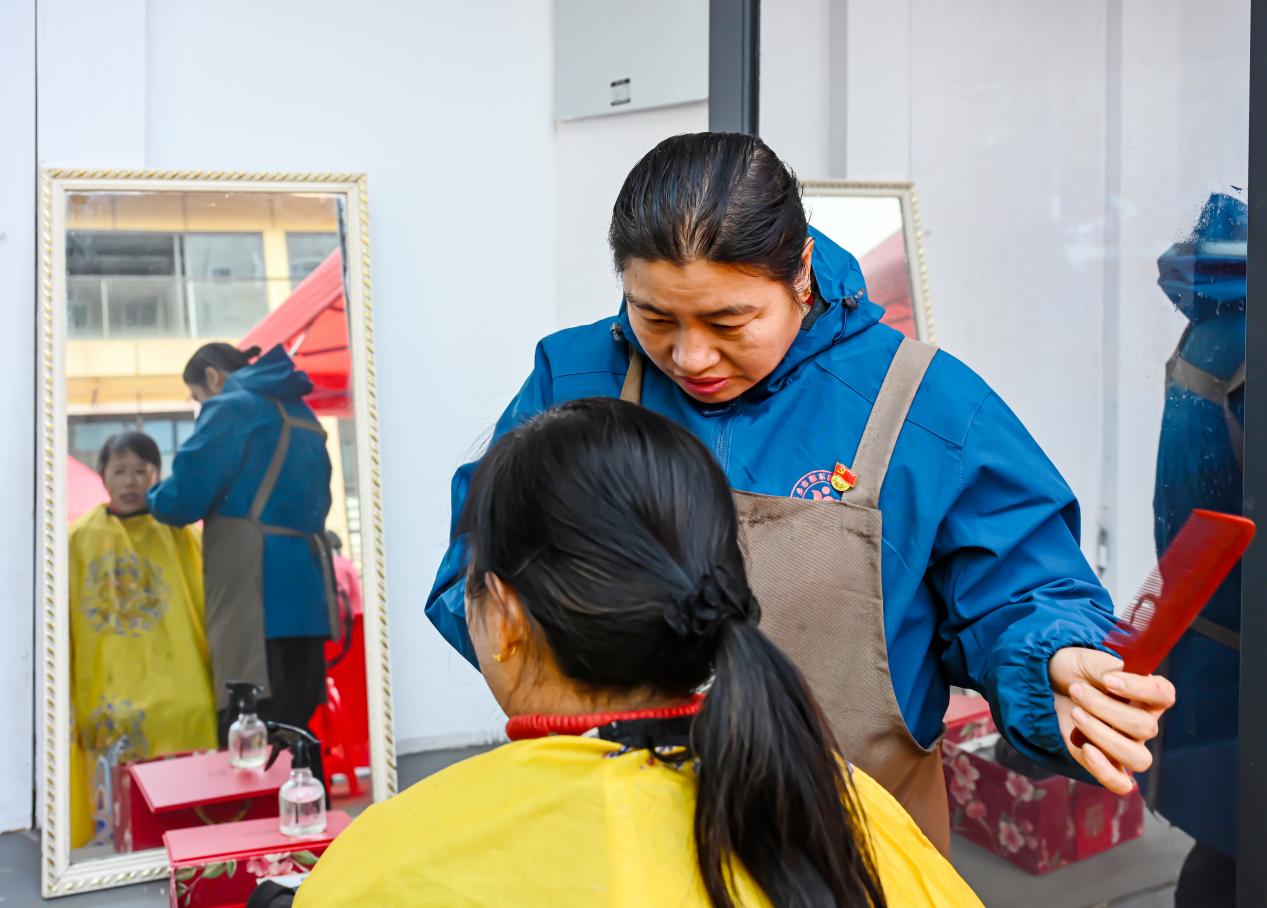 便民服务区志愿者热情周到,提供免费家务指导与理发服务,细心化解居民日常生活的小困扰。