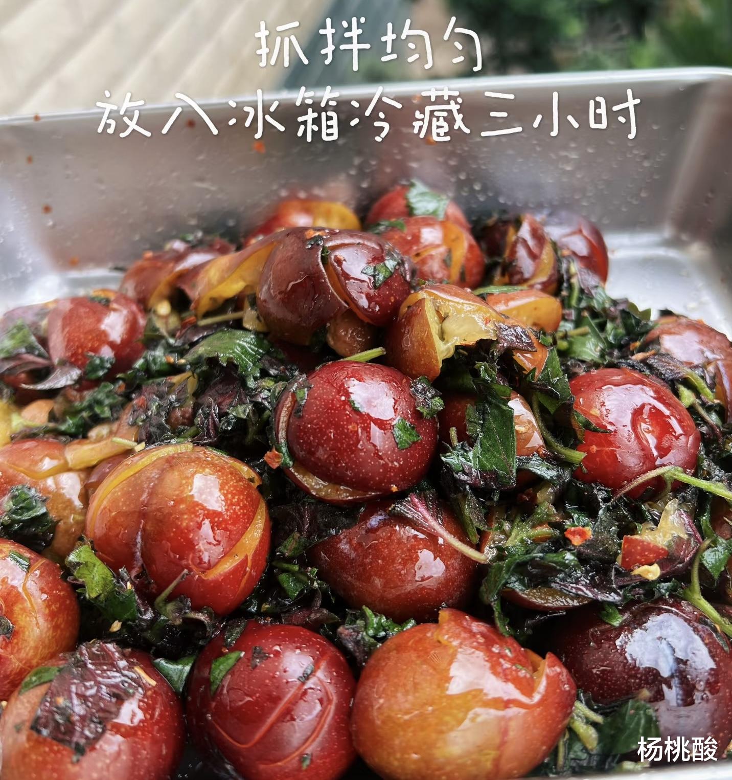 随后,便是灵魂配料的登场。新鲜的紫苏叶洗净切丝,那股独特的辛香气息,是这道美食的点睛之笔。将紫苏丝、大量的白糖、少许的甘草粉,若是再豪迈一些,还可以加入切碎的小米辣和蒜末,一并倒入李子中。最后淋上些许白米醋,用筷子或戴上一次性手套,将所有的食材充分搅拌均匀。当酸、甜、咸、辣、辛五种味道在盆中交织,那股诱人的香气便已让人垂涎欲滴。将拌好的李子装入密封罐,放入冰箱冷藏腌制数小时,待糖分完全融化,与果汁交融,便可开罐享用。