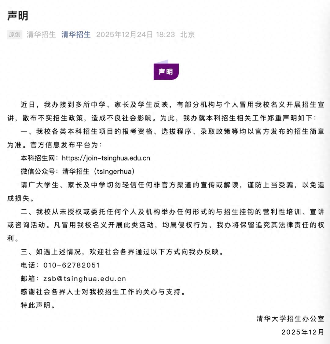 12月24日,清华大学招生办公室发布声明称,清华大学招生办公室接到多所中学、家长及学生反映,有部分机构与个人冒用清华大学名义开展招生宣讲,散布不实招生政策,造成不良社会影响。