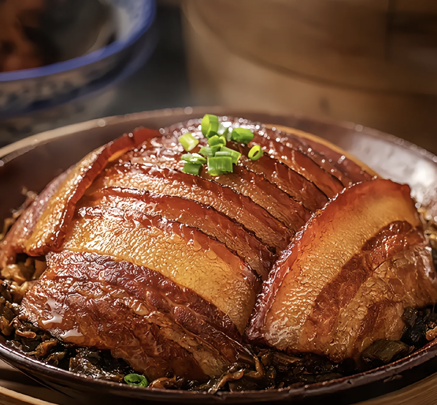 时间一到,小心地从蒸锅中取出碗,一道色香味俱全的梅菜扣肉就大功告成啦!可以直接吃,也可以拿上荷叶饼,把梅菜扣肉夹在里面,咬上一口,肉的软糯、梅干菜的咸香完美融合,肥而不腻,真的太香了,好吃到停不下来。