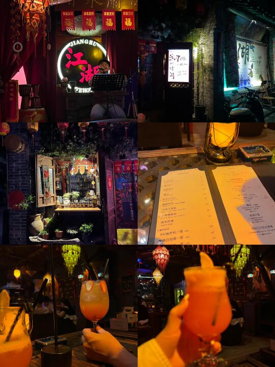 p11东关街江湖酒馆[得意R] 装修风格很喜欢 氛围感蛮好的 还有会用乐器伴奏敲鼓点儿 但我听的那两首唱的一般 服务态度很好~ 饮品味道也一般 毕竟去那种清吧就是感受氛围