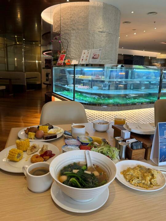 部分套房可俯瞰山河景观,还可以叫早餐去房间里吃,直接去MoMo Café自助餐厅吃早餐,种类更丰盛