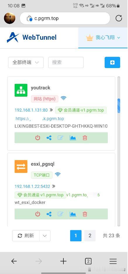 想在手机上操作内网穿透吗? 想在手机上穿透家里的群晖吗? 还在头疼手机操作不方便的事儿? 近期不少老铁反馈适配手机端显示的事情 这就来了🎉 现在起 手机浏览器输入 c.pgrm.top WebTunnel 控制台自动适配手机端、平板端、电脑端 让你在外也可以轻松操控 WebTunnel[白眼]