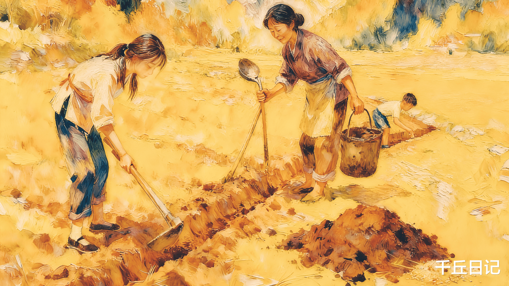 姐姐在很快地开沟,妈妈很快地舀粪摆在沟里,距离相等。