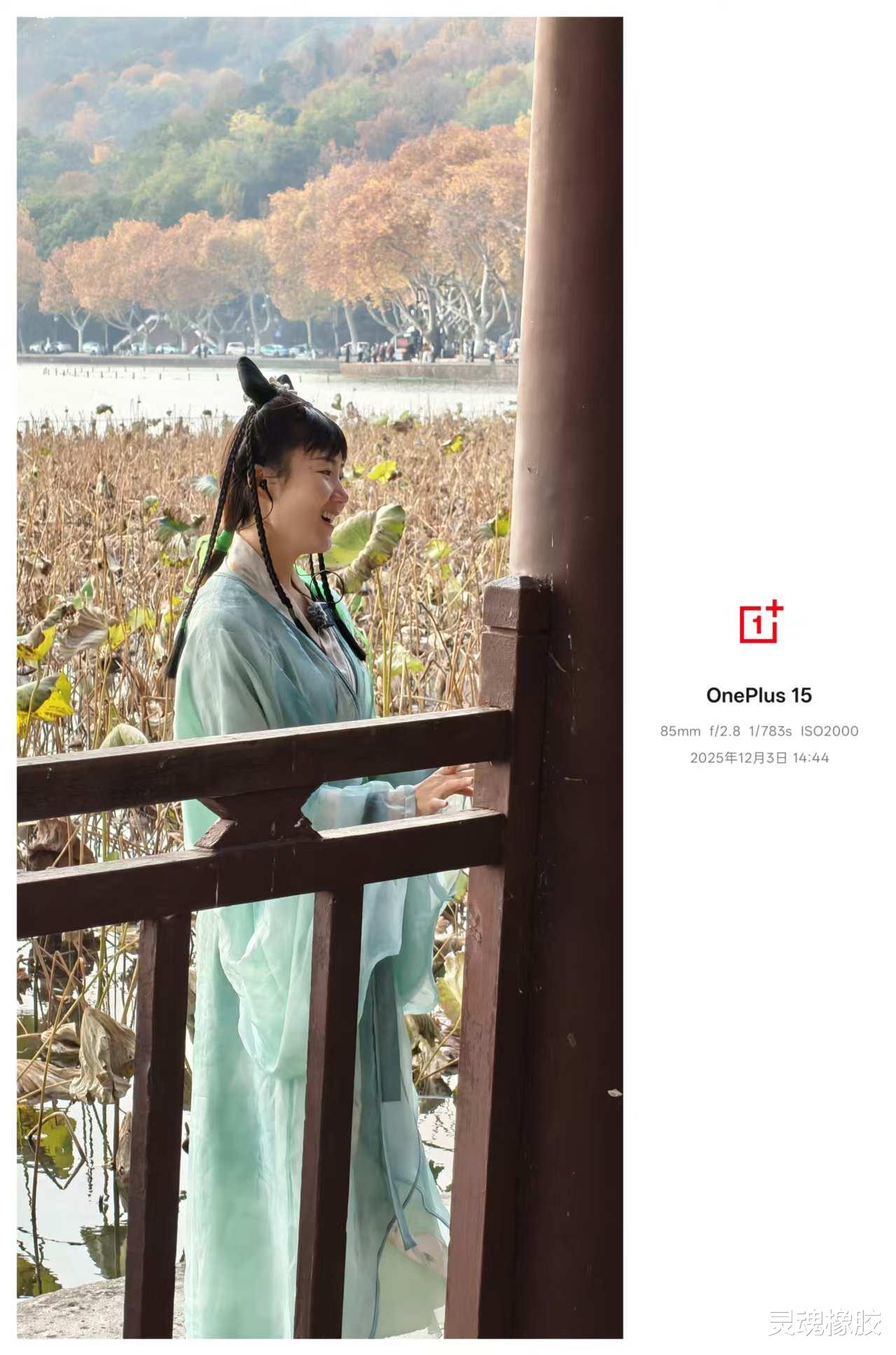 85mm的黄金人像焦段,在西湖岸边抓拍COS小青的主播妹妹,随手一拍,美美哒,我特别喜欢用一加拍照模式里的全屏模式,这个照片的比例配合一加的水印感觉很搭,其实一加15还支持多种摄影滤镜、拍摄模式以及AI一键消除反光,一键消除路人等功能,更多玩法期待大家的开发。