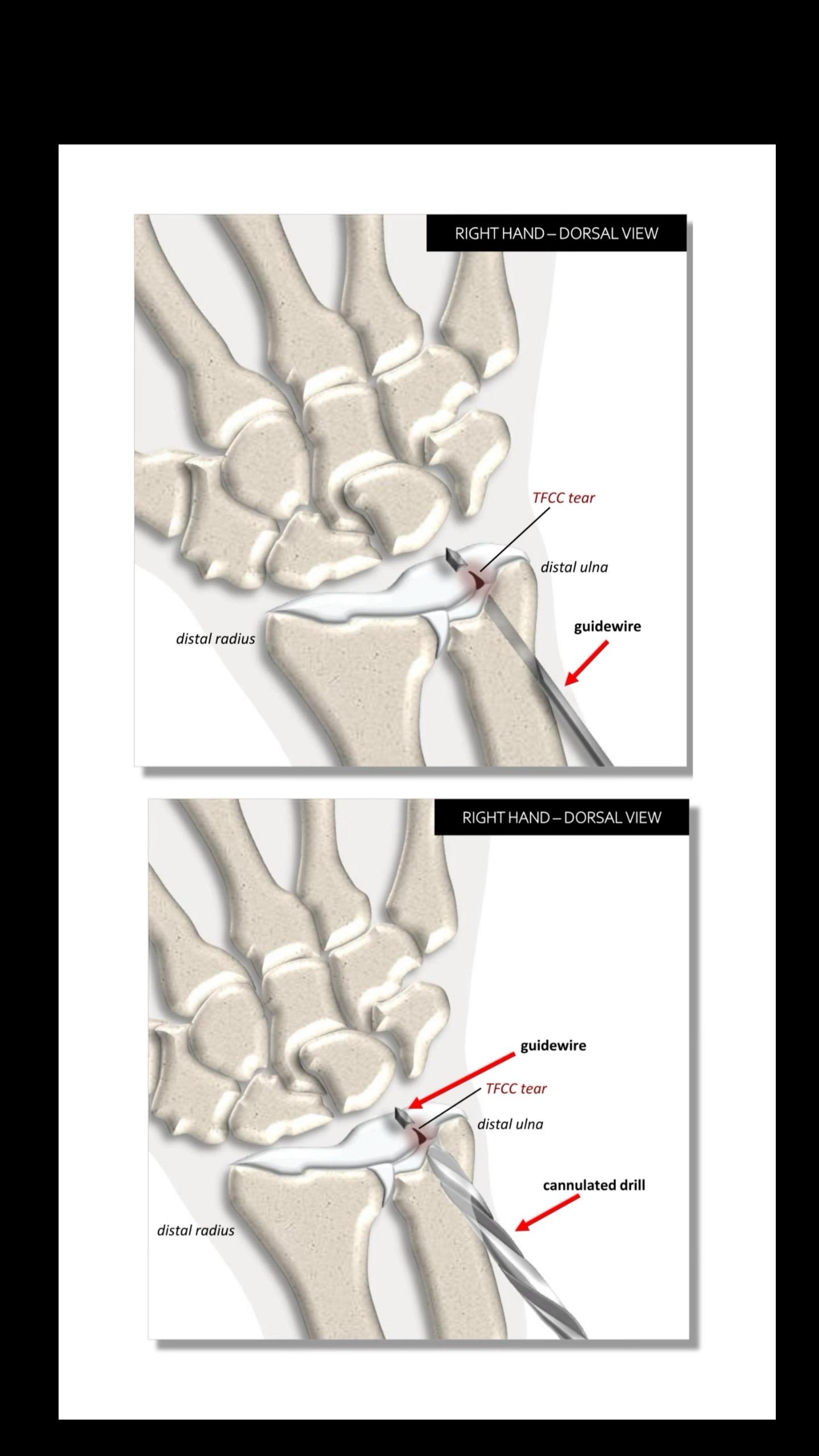 TFCC尺骨凹部骨隧道镜下修复术。TFCC撕裂合并尺骨凹部断裂及远端桡...