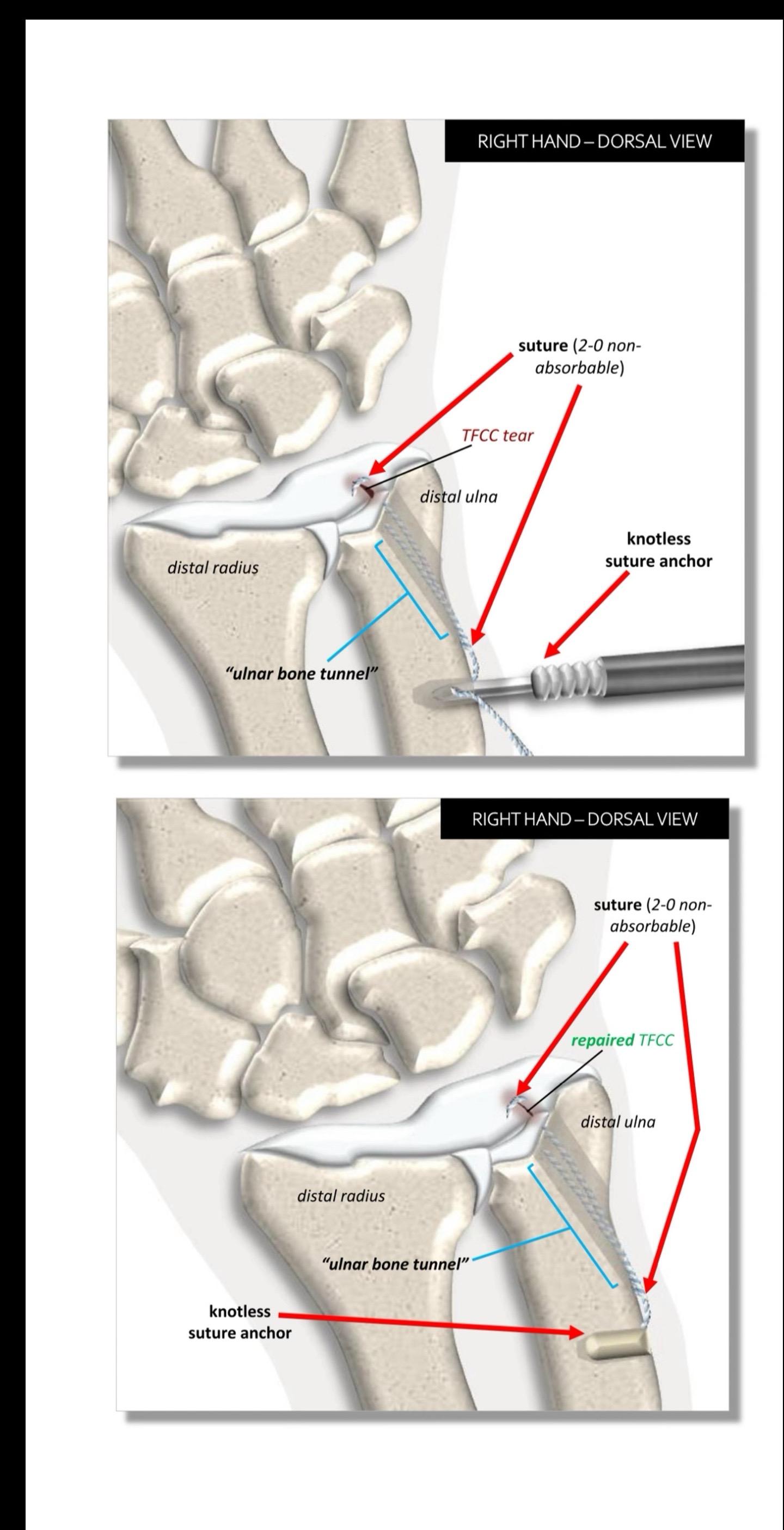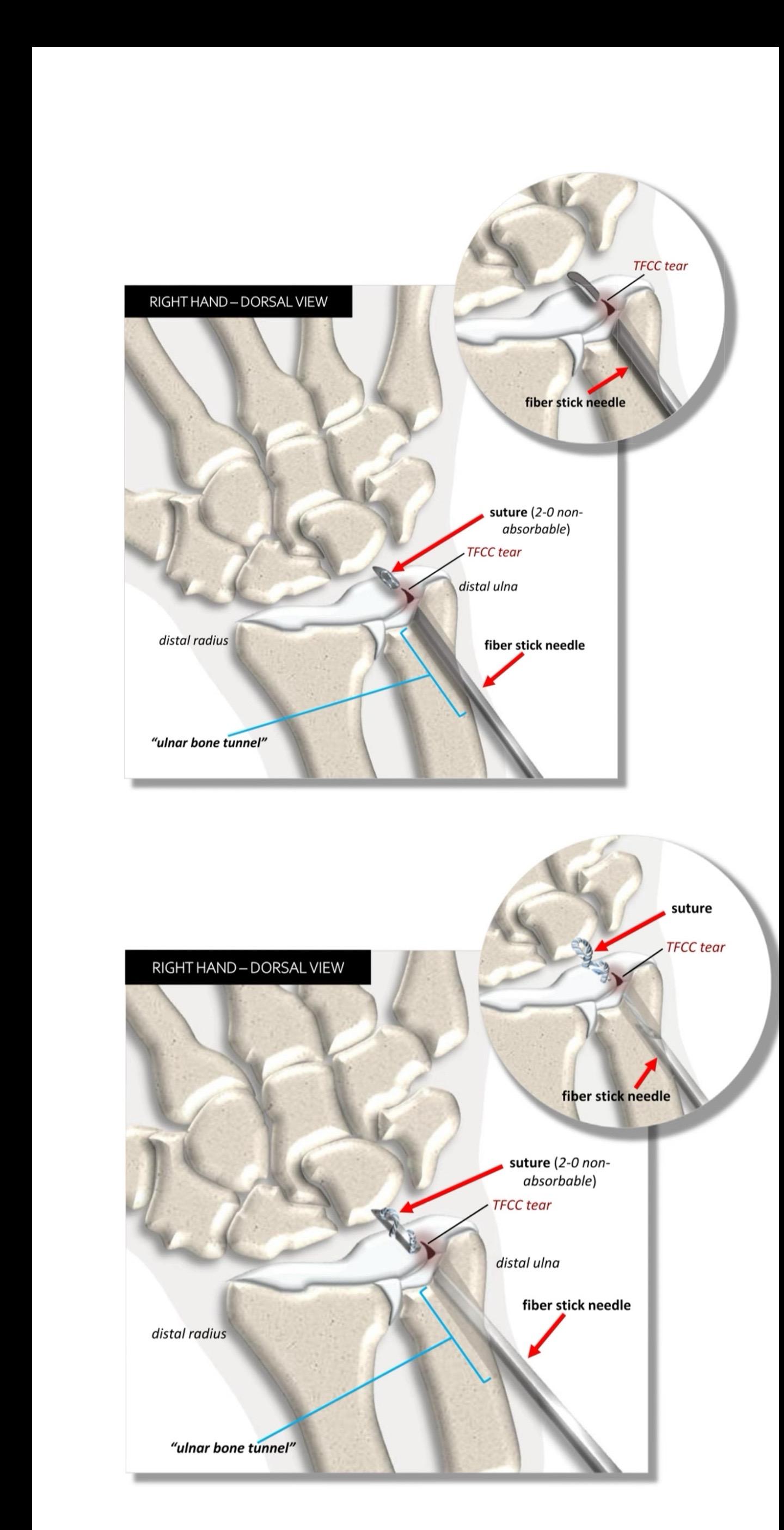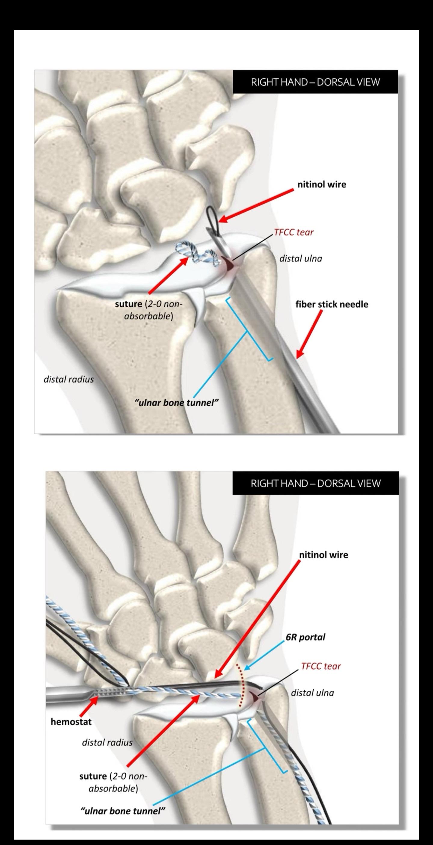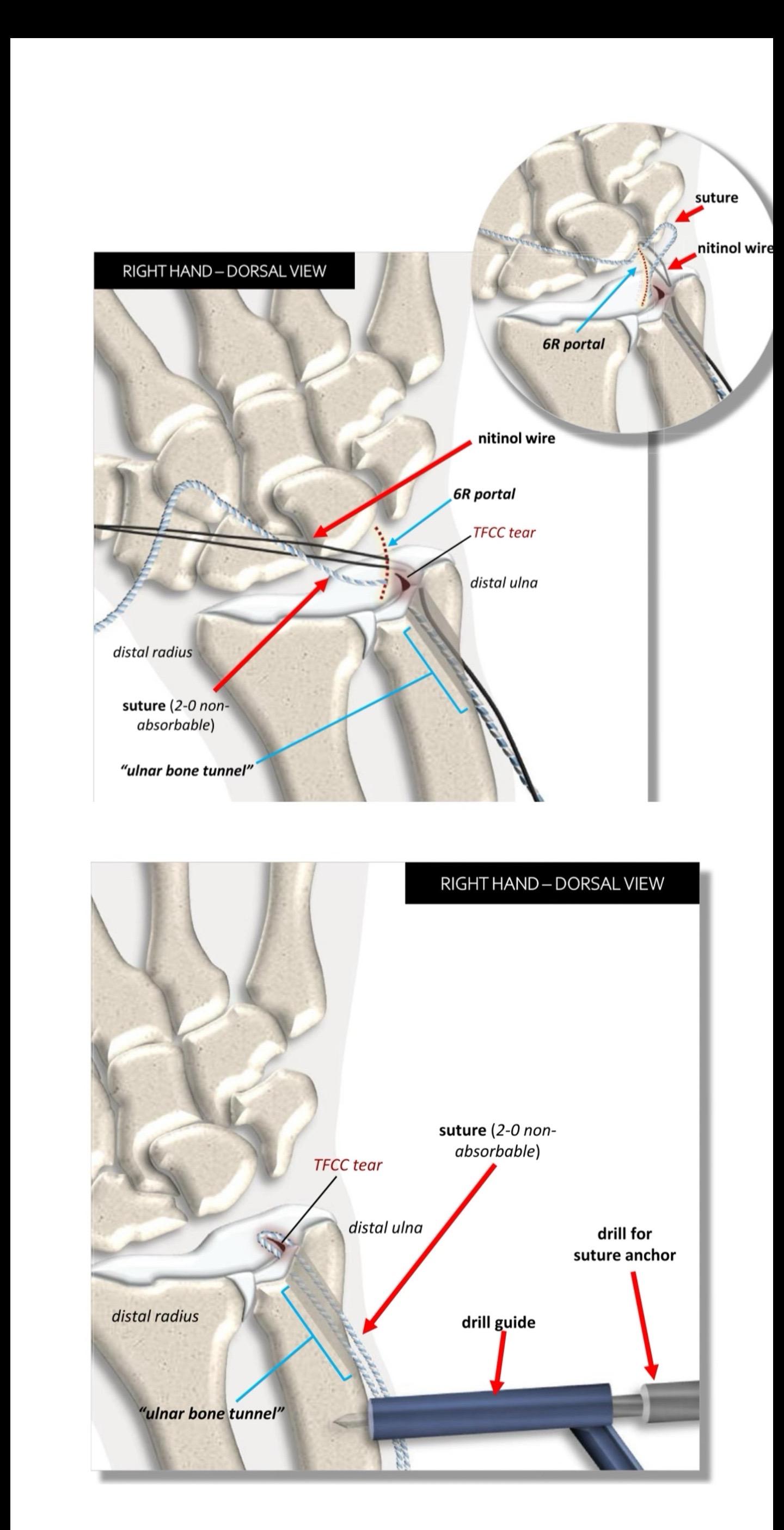 TFCC尺骨凹部骨隧道镜下修复术。TFCC撕裂合并尺骨凹部断裂及远端桡尺关(DRUJ)不稳,则需将TFCC直接固定修复至尺骨凹部。