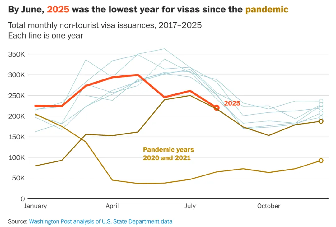 不少人第一反应或许是:这不就是正常波动吗?毕竟疫情期间美国签证数量也曾大幅下滑。但这一次,情况截然不同。疫情时期是“办不了”,而2025年的收缩,更像是“主动收紧”。