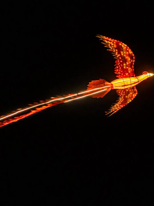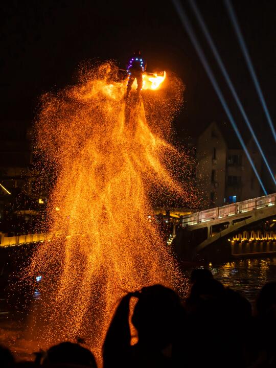 夜晚的水中火壶,空中飞龙火壶飞龙秀像穿越仙侠剧!