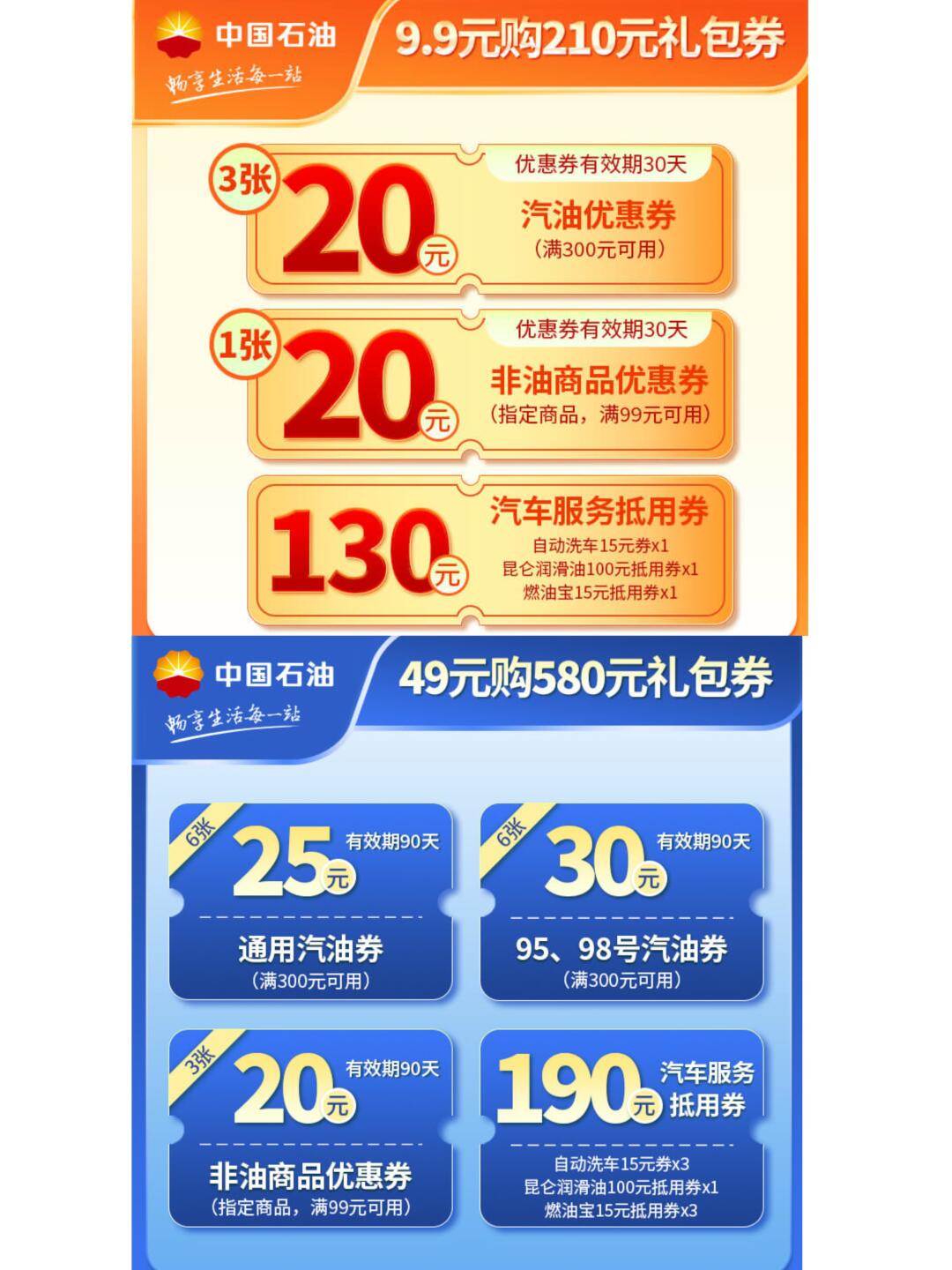 💰49购580的礼包,其中300-20的加油券6张,95、98满300-30的6张
