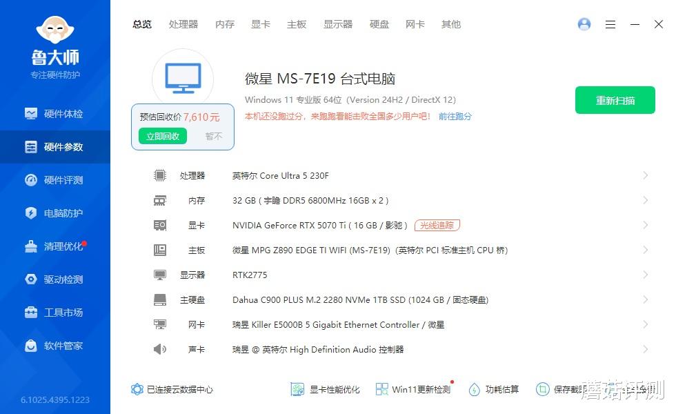 ▼整机配置一览,处理器是230F,主板是微星的MPG Z890 EDGE TI刀锋钛,显卡是影驰的RTX 5070 Ti星曜LUNA。