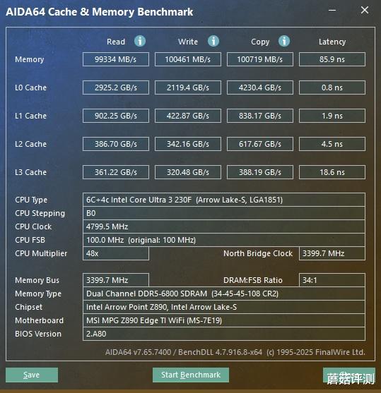 ▼内存频率在6800MHz,在主板BIOS中选择BenchMark优化模式,内存读取速度99344MB/s、写入速度100496MB/s、复制100218MB/s,延迟86.1ns。