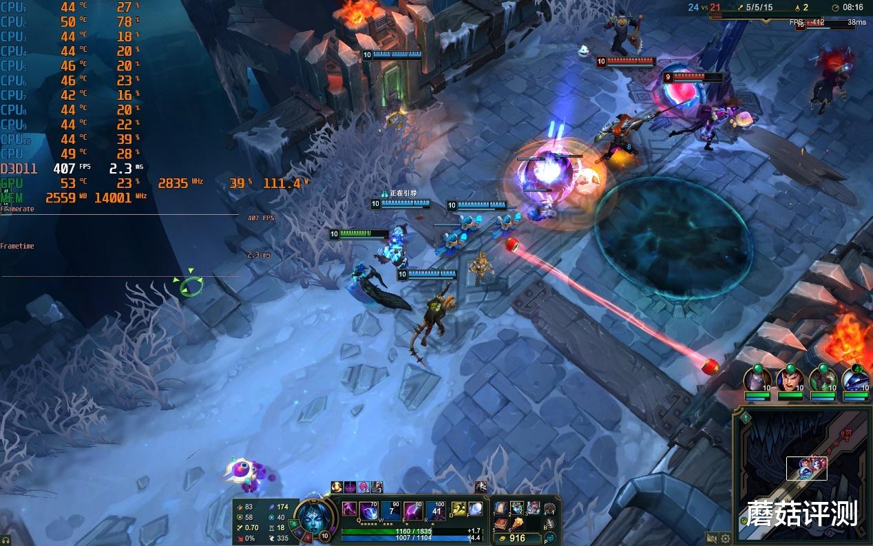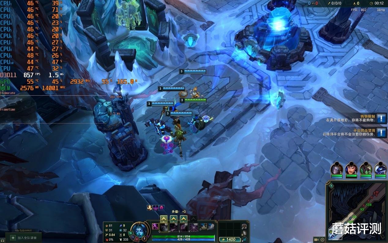 ▼游戏实测,LOL大乱斗模式,2K分辨率,全高画质,泉水游戏帧数在857帧左右,表现不错。