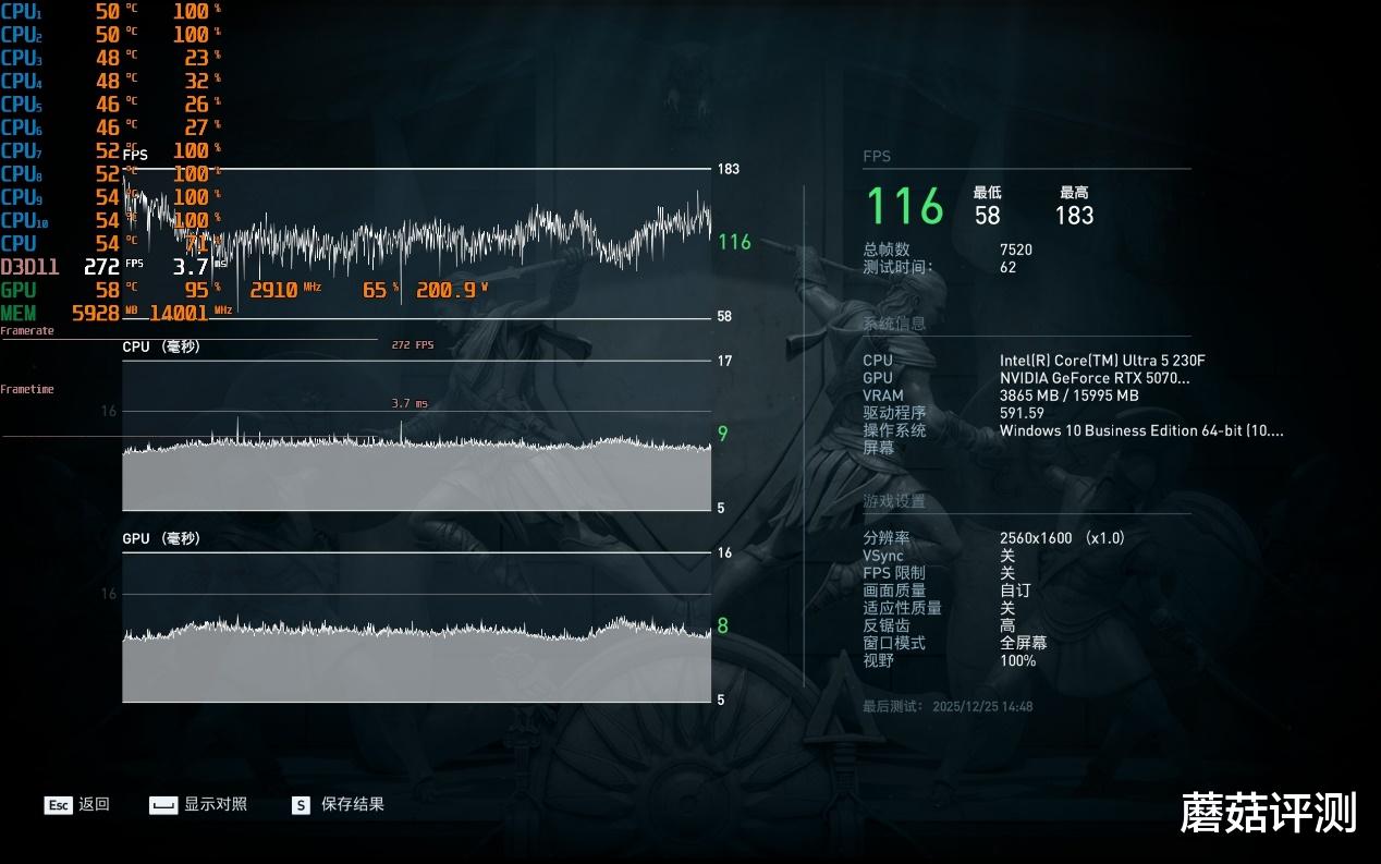 英特尔(Intel)的这颗酷睿 Ultra 5 230F 处理器的综合表现还是非常不错,其拥有非常不错的单核性能、以及出乎意料的多核性能,在拥有更大的24MB的三级缓存、以及最高5GHz的最大睿频频率的情况下,可以让这张RTX 5070 Ti显卡在绝大多数游戏中充分发挥性能,不错不错。