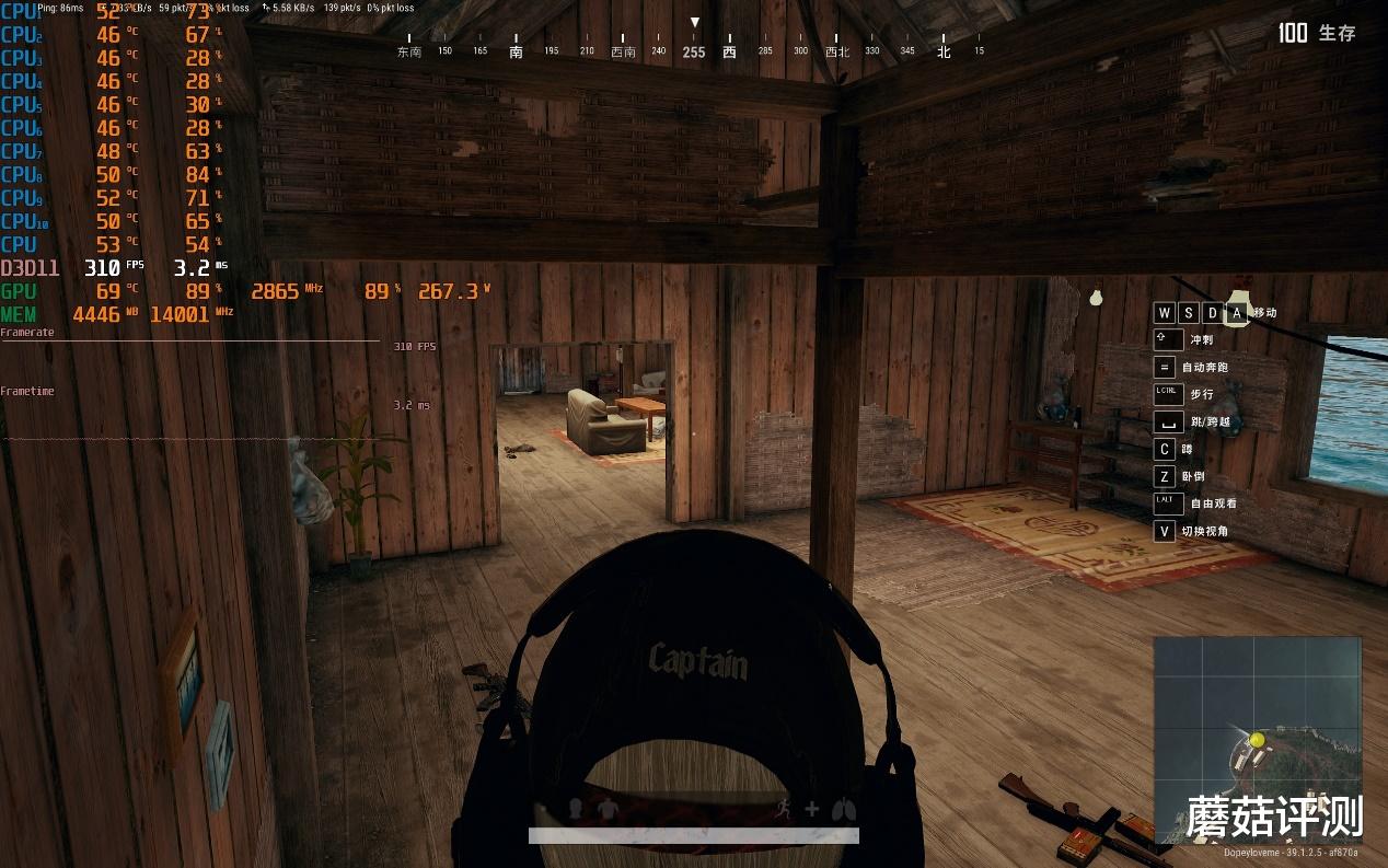 ▼室内游戏帧数在310帧左右,显卡的占用在89%左右,也还可以。