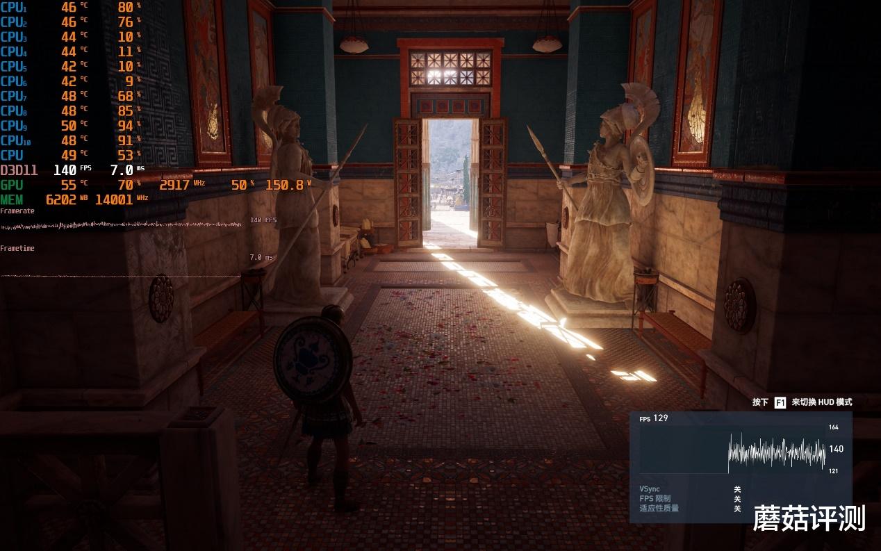 ▼众生平等奥德赛,2K分辨率,极高画质,体积云最低,走廊游戏帧数在140帧左右,显卡占用70%,处理器占用53%。
