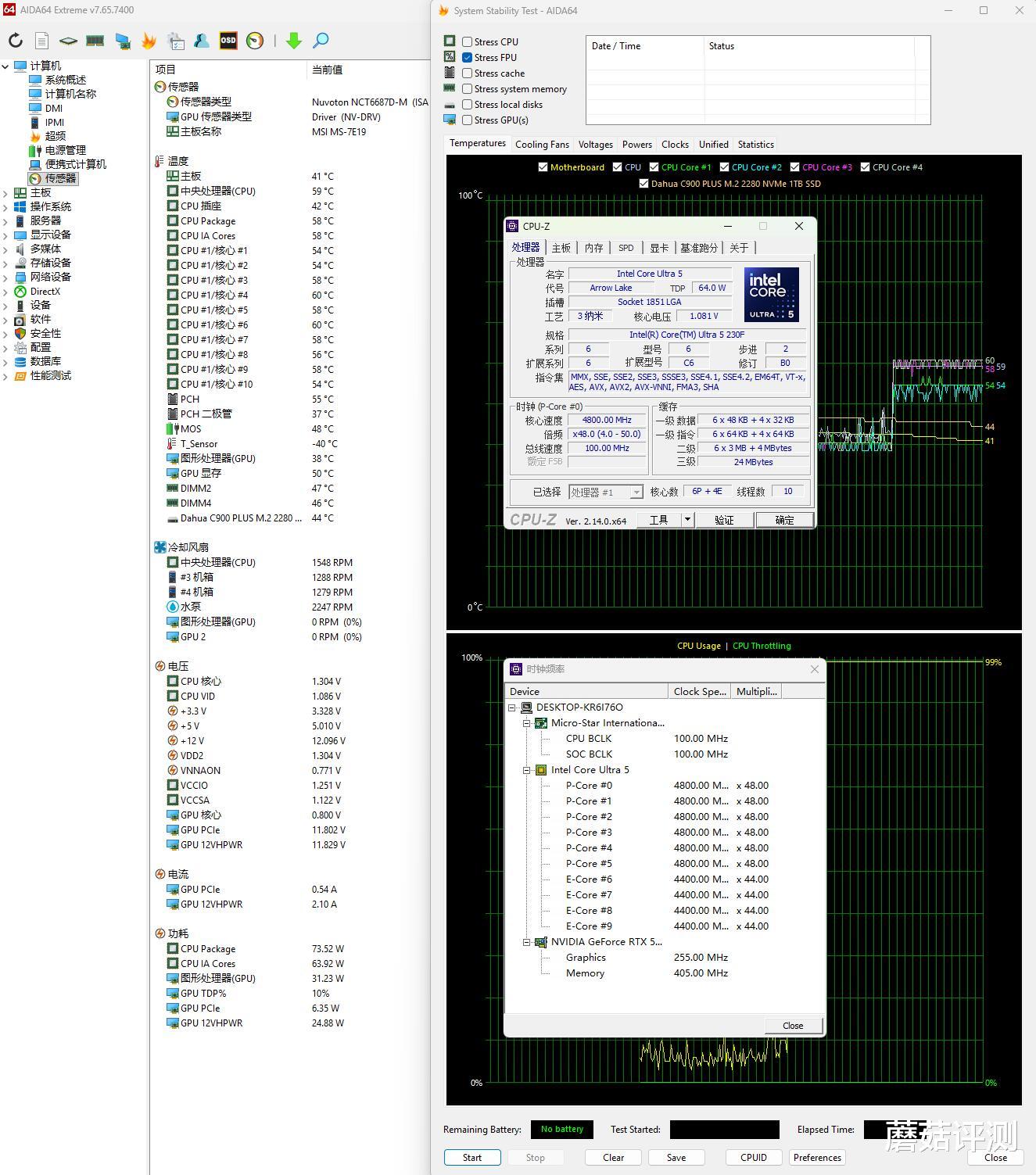 ▼跑个CPU-Z的压力测试,处理器功耗在75W左右,P核睿频4.8GHz、E核睿频4.4GHz,温度59℃。