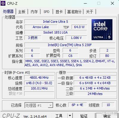 ▼简单看下这颗230F的硬件规格,拥有6个P核、4个E核、三级缓存24MB。