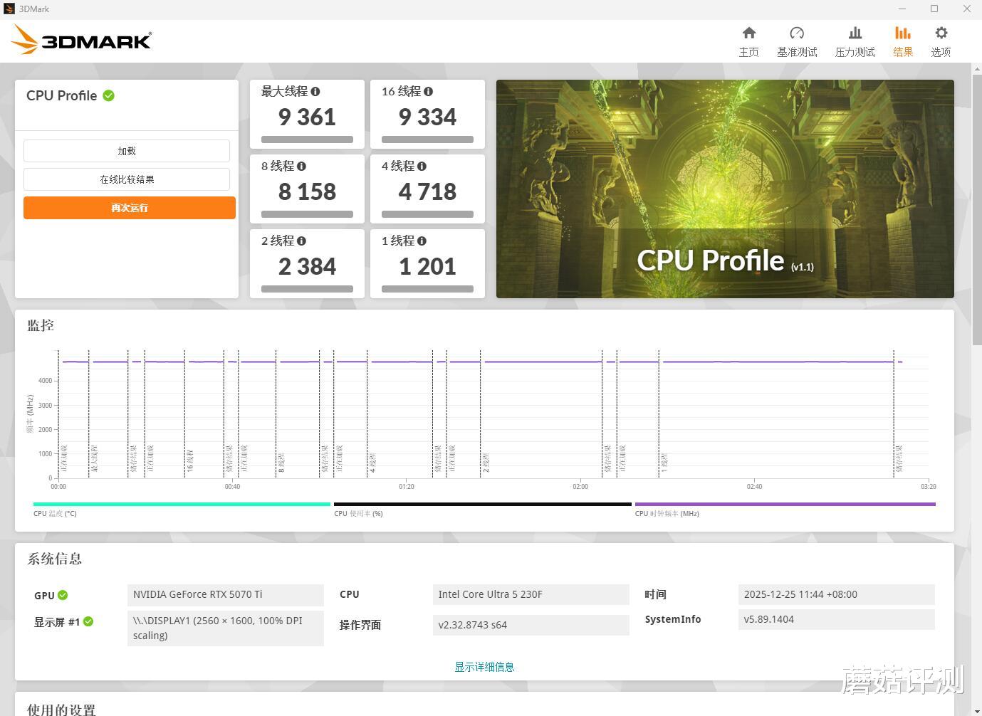 ▼跑个3Dmark的CPU测试,1线程得分1201,4线程得分4718,8线程得分8158,最大线程得分9361,可以看出,P核的性能真强,E核的性能也就那样。