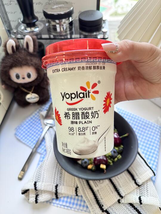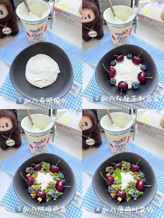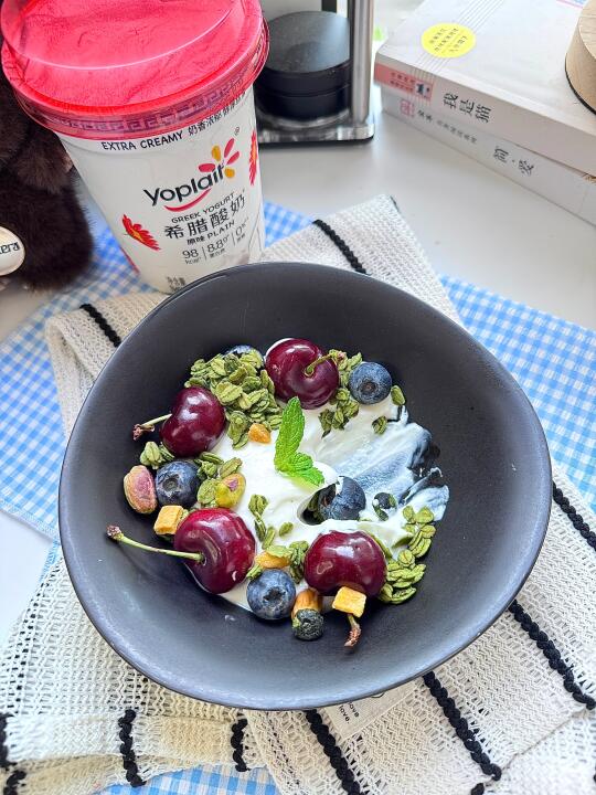 酸奶碗材料:优诺希腊酸奶|烘焙燕麦片|车厘子|蓝莓 制作步骤: 1️⃣加入希腊酸奶 2️⃣加入车厘子和蓝莓 3️⃣加入烘焙燕麦片 4️⃣加入薄荷叶装饰 我用的这款优诺希腊式酸奶 质地浓厚丝滑 不需要过滤就可以吃到糊嘴的口感哦 热量低饱腹感还强哦 还0蔗糖的 健康又美味~