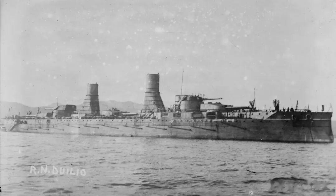 1940年11月11日至12日夜,英国地中海舰队对塔兰托发动了著名的夜间空袭。从光辉号航空母舰起飞的21架剑鱼式鱼雷轰炸机攻击了港内舰艇。多利亚号未受损,但卡约·杜伊利奥号右舷被鱼雷击中。为防沉没,该舰抢滩搁浅,经临时修理后前往热那亚进行永久性修复,修复工作持续至1941年5月。其间,英国H舰队曾试图炮击坞修中的卡约·杜伊利奥号,但未命中。