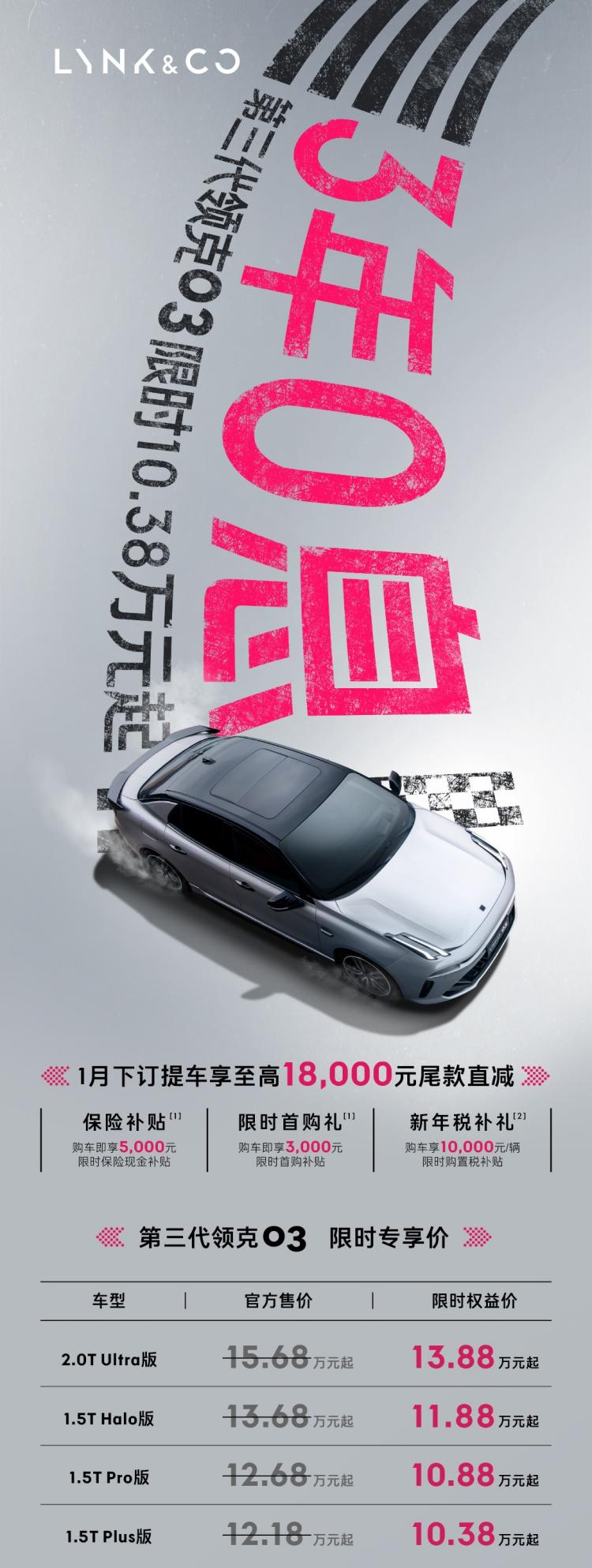 正值1月购车黄金期,领克03家族推出“冰雪畅行计划”,大幅降低购车门槛。第三代领克03以10.38万元起售,提供“6万2年0息”或“5年贷3年0息”方案,支持0首付申请,减轻年轻消费者压力;新领克03+性能进阶版享受“2年15万0息”福利,让性能车不再遥不可及。此外,购车即赠雪场季卡、保险补贴与置换补贴,配合终身免费道路救援与数据流量服务,进一步提升购车性价比。