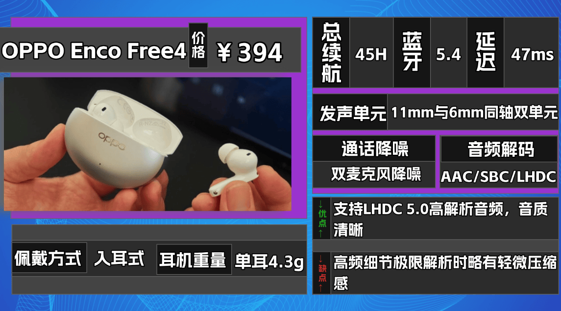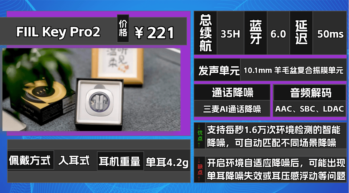 ★耳机整体设计小巧精致,充电盒还兼具手机支架功能,实用性较高。降噪方面,配备“前馈+后馈+通话”六麦克风阵列,结合自研AI降噪3.0芯片,实测中低频段噪音抑制明显,对地铁、公交等通勤环境尤其有效。音质方面采用11mm羊毛纸复合振膜单元,配合BassUp低频增强技术,低频下潜至20Hz澎湃有力,高频延展通透而不刺耳,中频偏温和,人声情感略显克制。支持LDAC 24bit/96kHz无损传输,同时提供3D全景音效和游戏音效模式,可实现手游低延迟与声画同步,音乐与游戏双场景表现均衡。