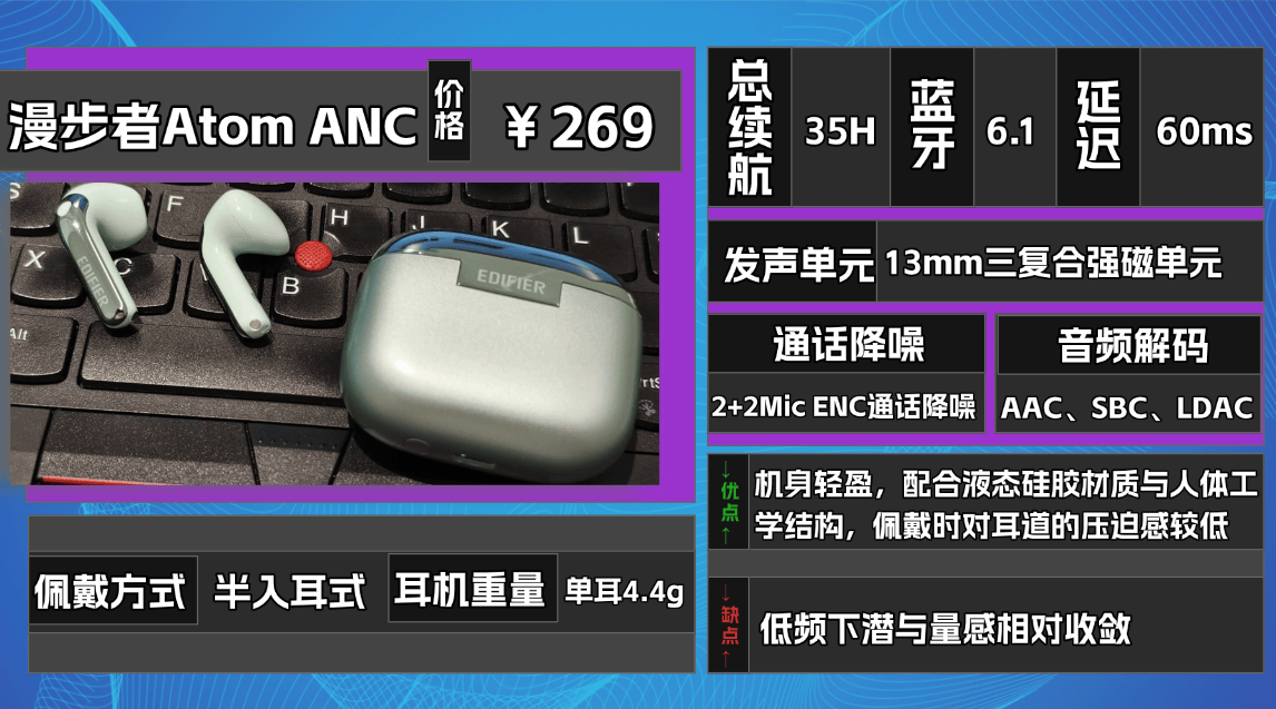 ②漫 步者A tom ANC蓝牙耳机
