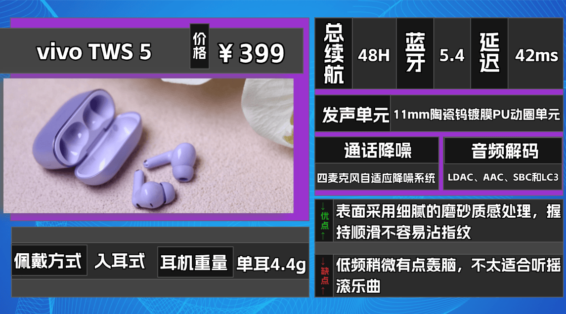★这款耳机佩戴时对耳道压追感较低,适合不喜欢"闷耳感”的用户。充电盒采用偏扁的圆润造型,表面为细腻哑光处理,便携性不错。触控支持敲击与滑动操作,日常播放、切歌与音量调节比较顺手。音质方面采用双单元方案,整体走清晰、干净取向:高频细节较为通透,人声清晰不糊,中频结像自然;低频存在感在线。