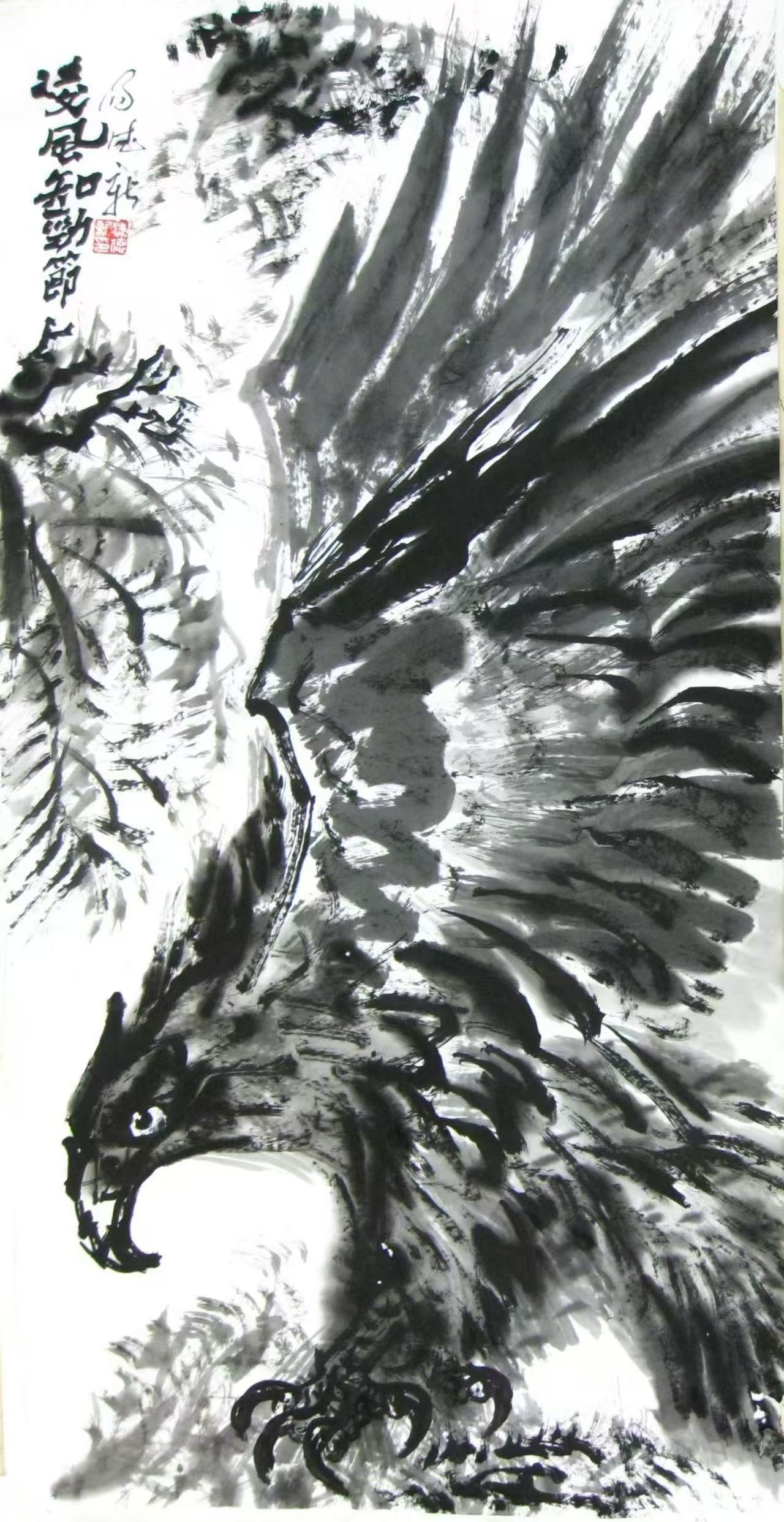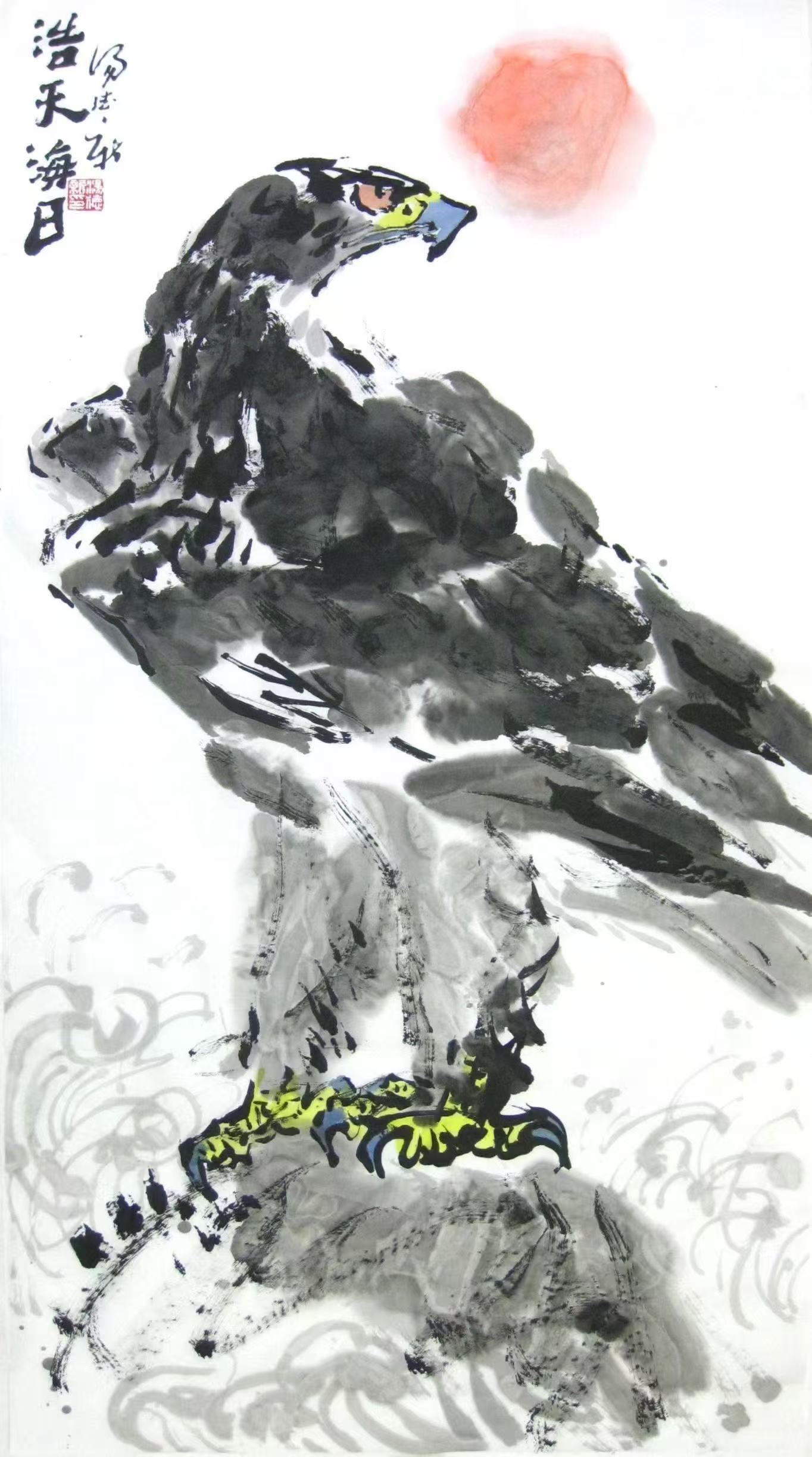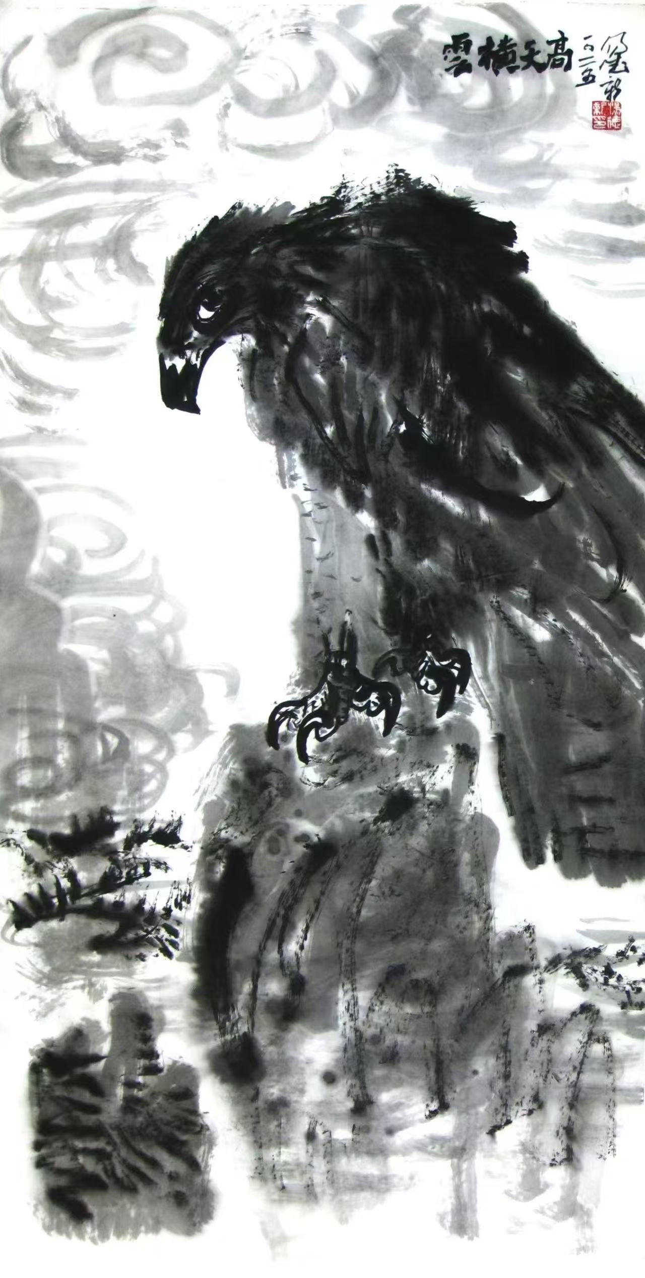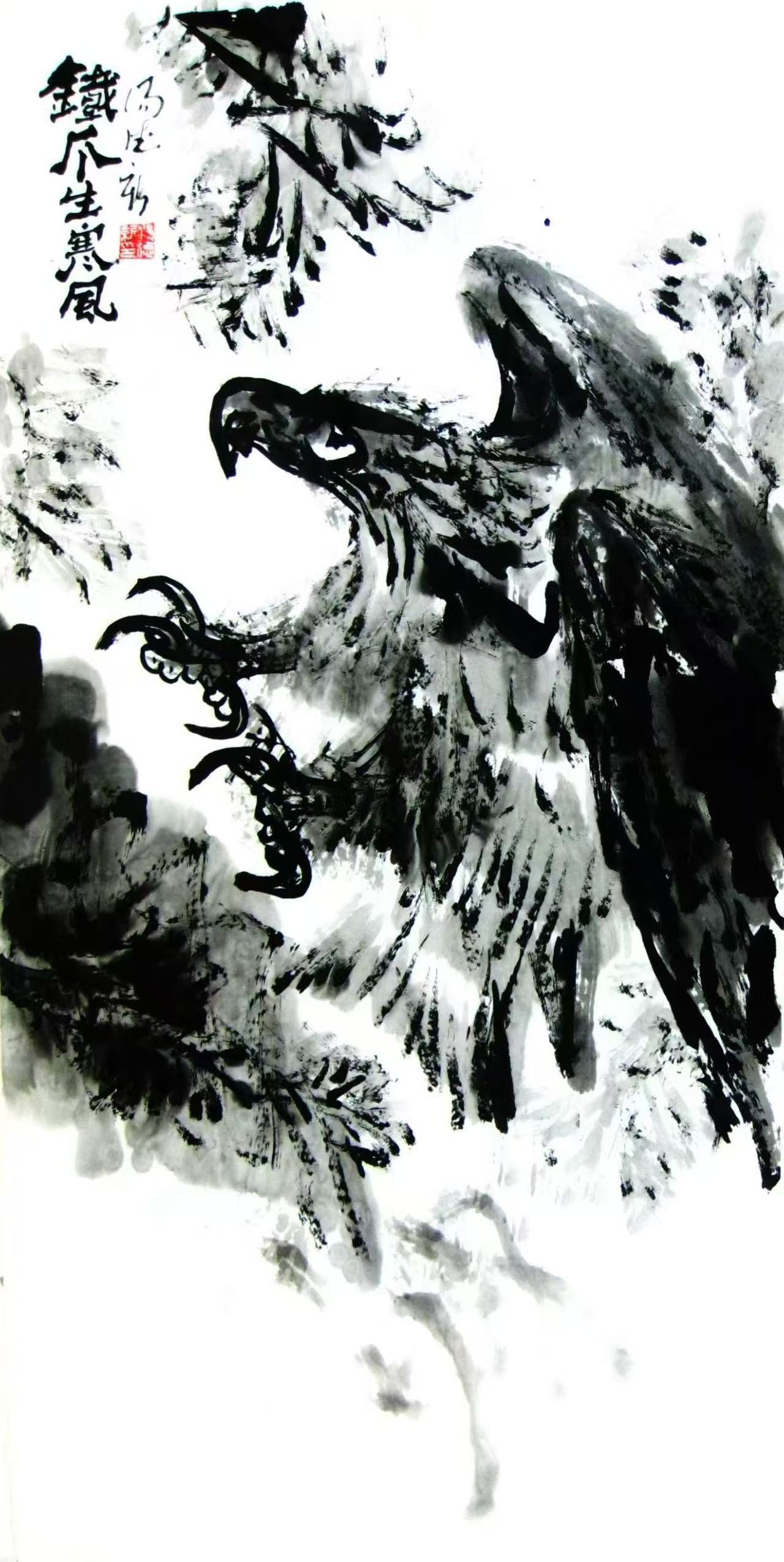 擅长山水、人物、花鸟画,尤以雄鹰题材著称,作品风格雄浑豪放,代表作包括《孤云独去》《大风拂野》等,构图饱满、笔力遒劲,具有强烈视觉张力!