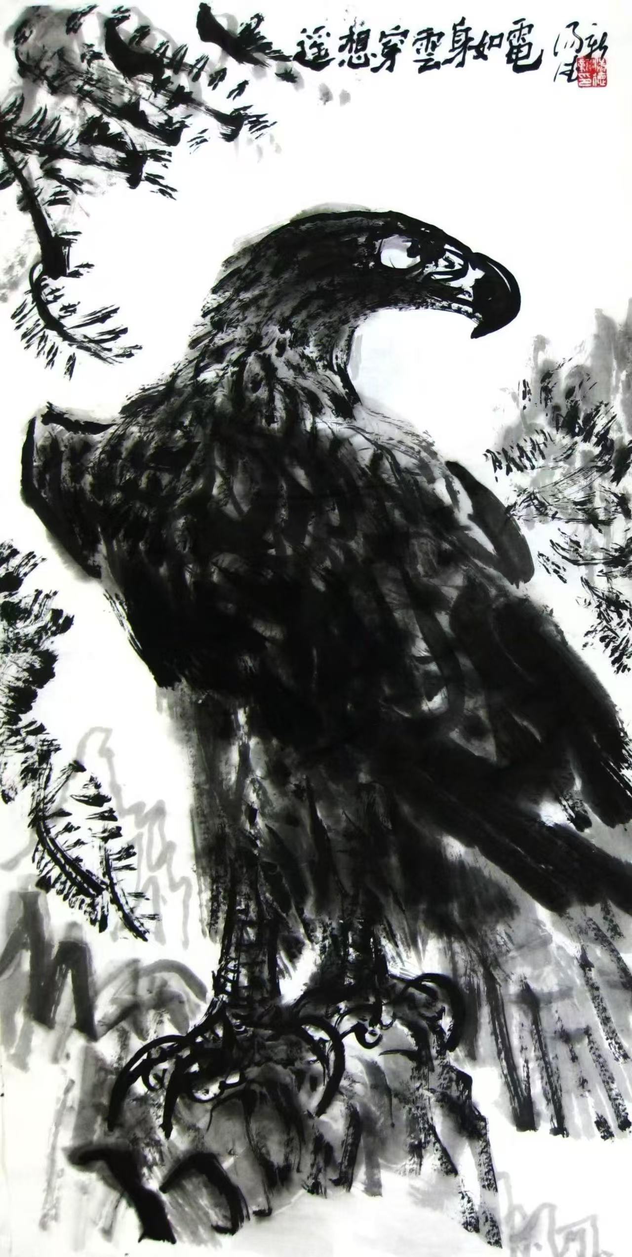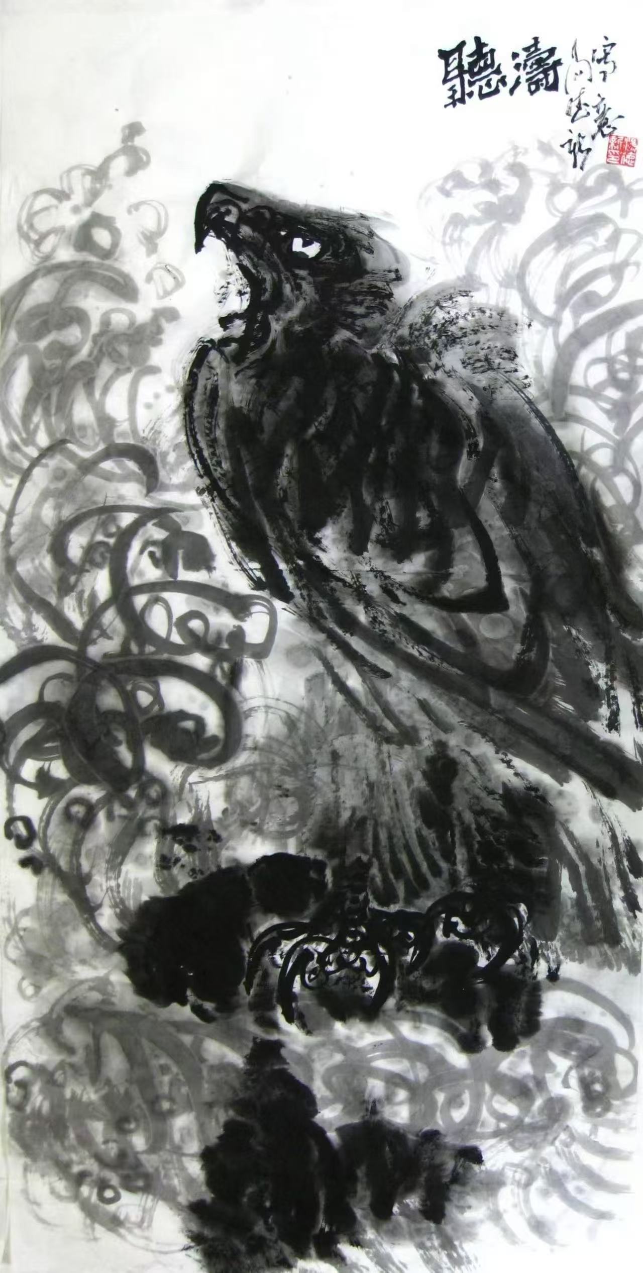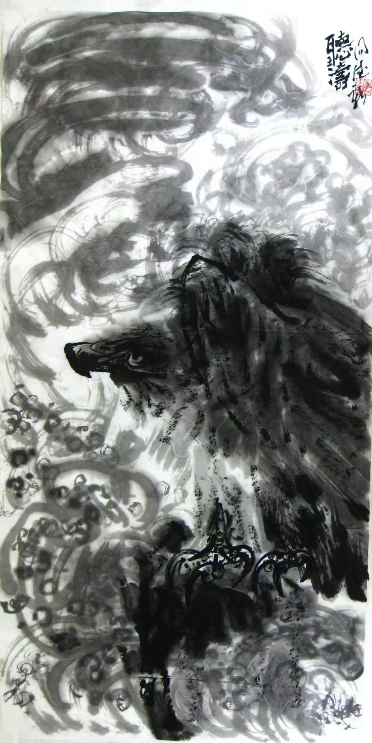 在《大风拂野》中,他以狂草的笔法绘制雄鹰的羽毛,中锋行笔时,线条如“屋漏痕”般自然流淌,沉稳而有力,勾勒出鹰羽的骨架与坚韧;侧锋行笔时,飞白笔法的运用恰到好处,线条枯涩却富有韵律,精准模拟出羽毛的蓬松质感与随风飘动的动态。整幅作品中,线条不再是简单勾勒雄鹰外形的工具,而是成为表达雄鹰精神、传递画面意境的核心元素,其韵律感与节奏感,与西方抽象表现主义绘画形成了跨文化的审美呼应。这种将书法线条转化为绘画语言的创作方式,让线条在保留传统文化底蕴的同时,获得了现代的抽象审美价值,实现了传统线条的当代转型。