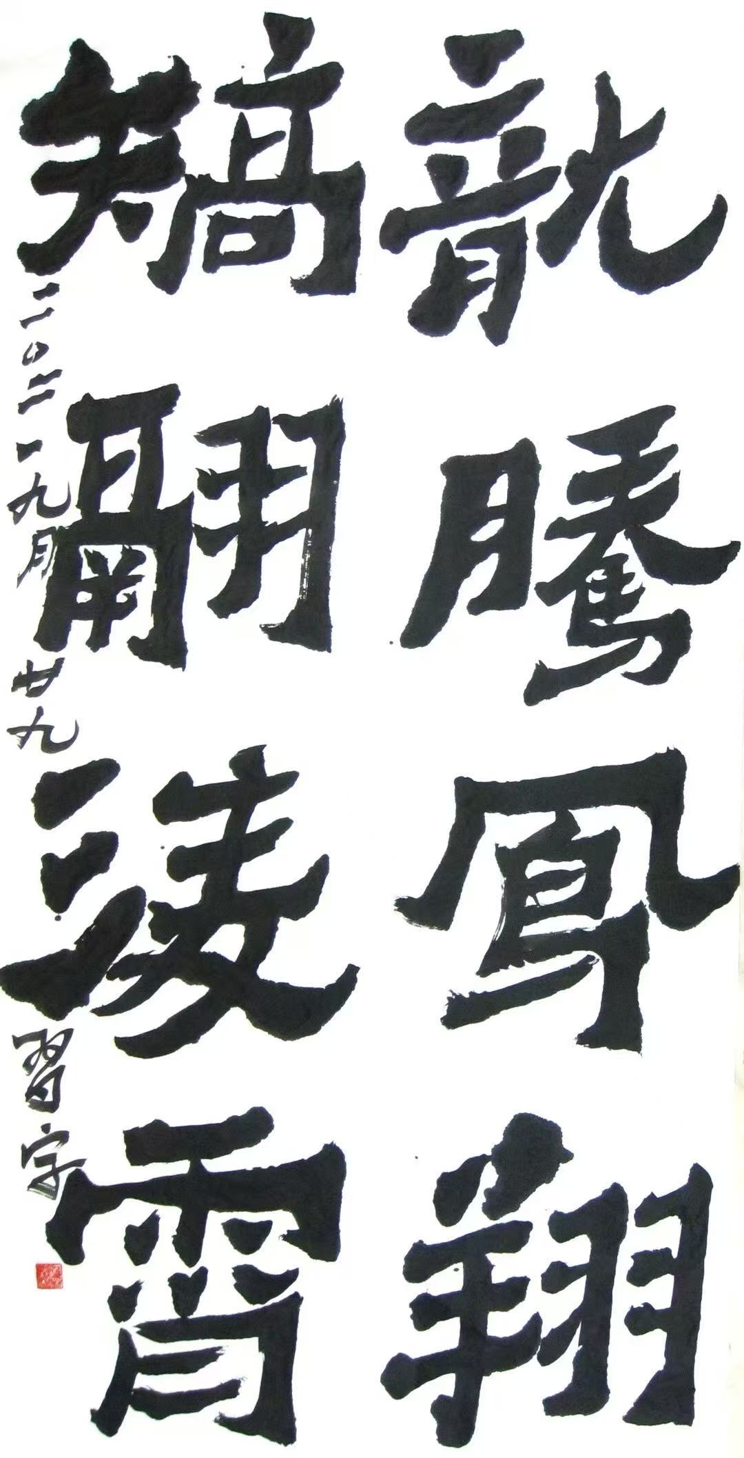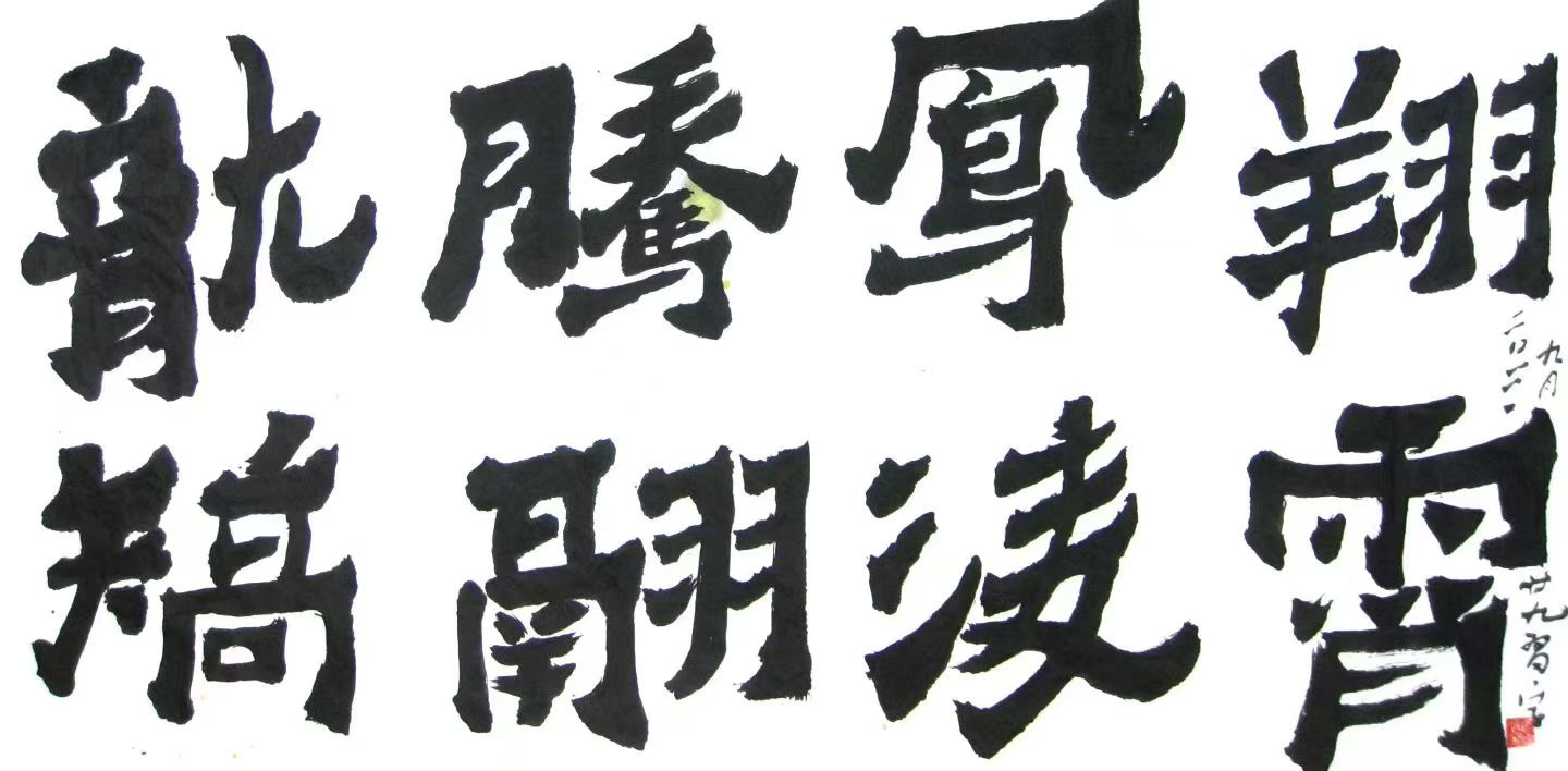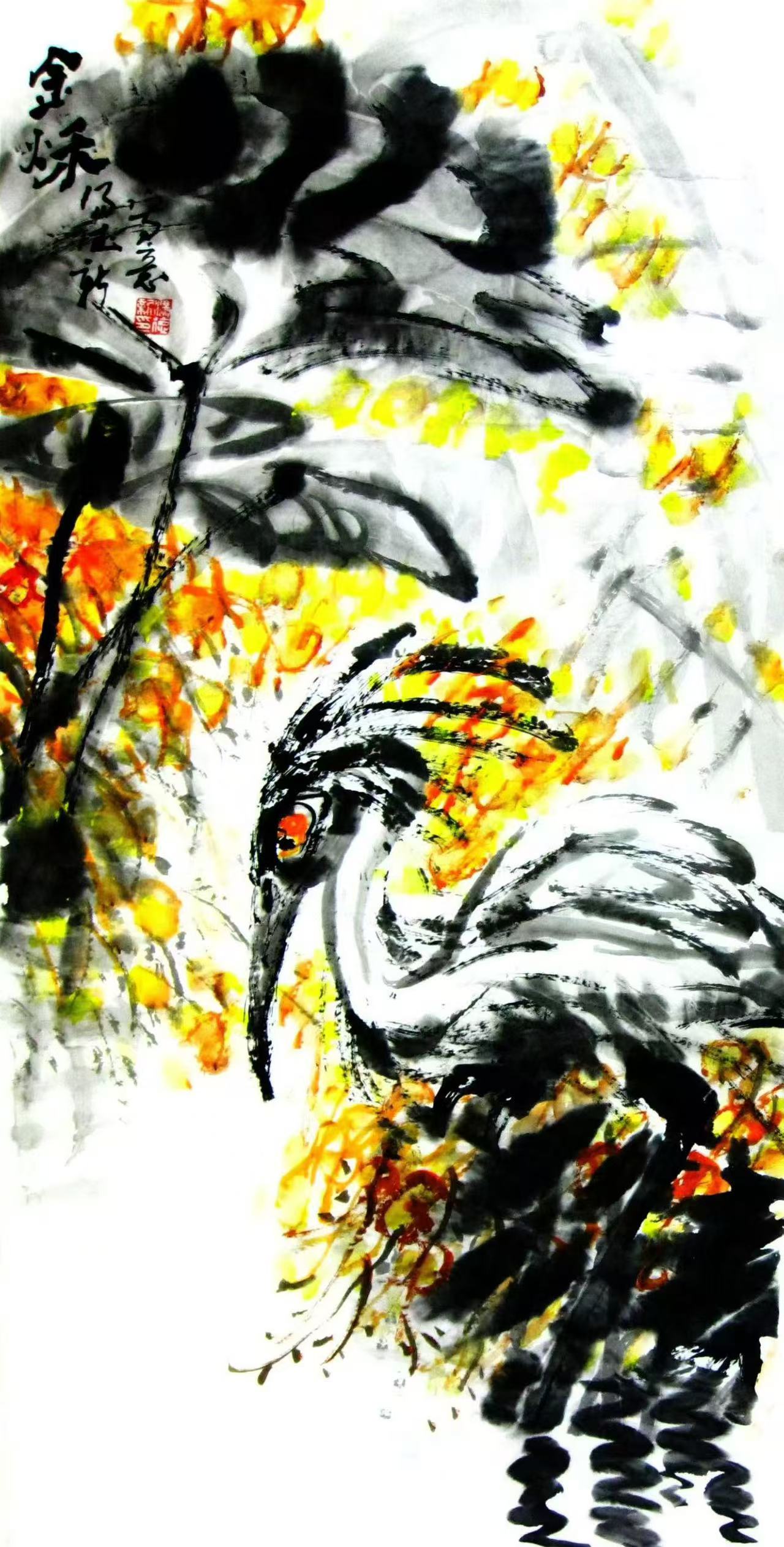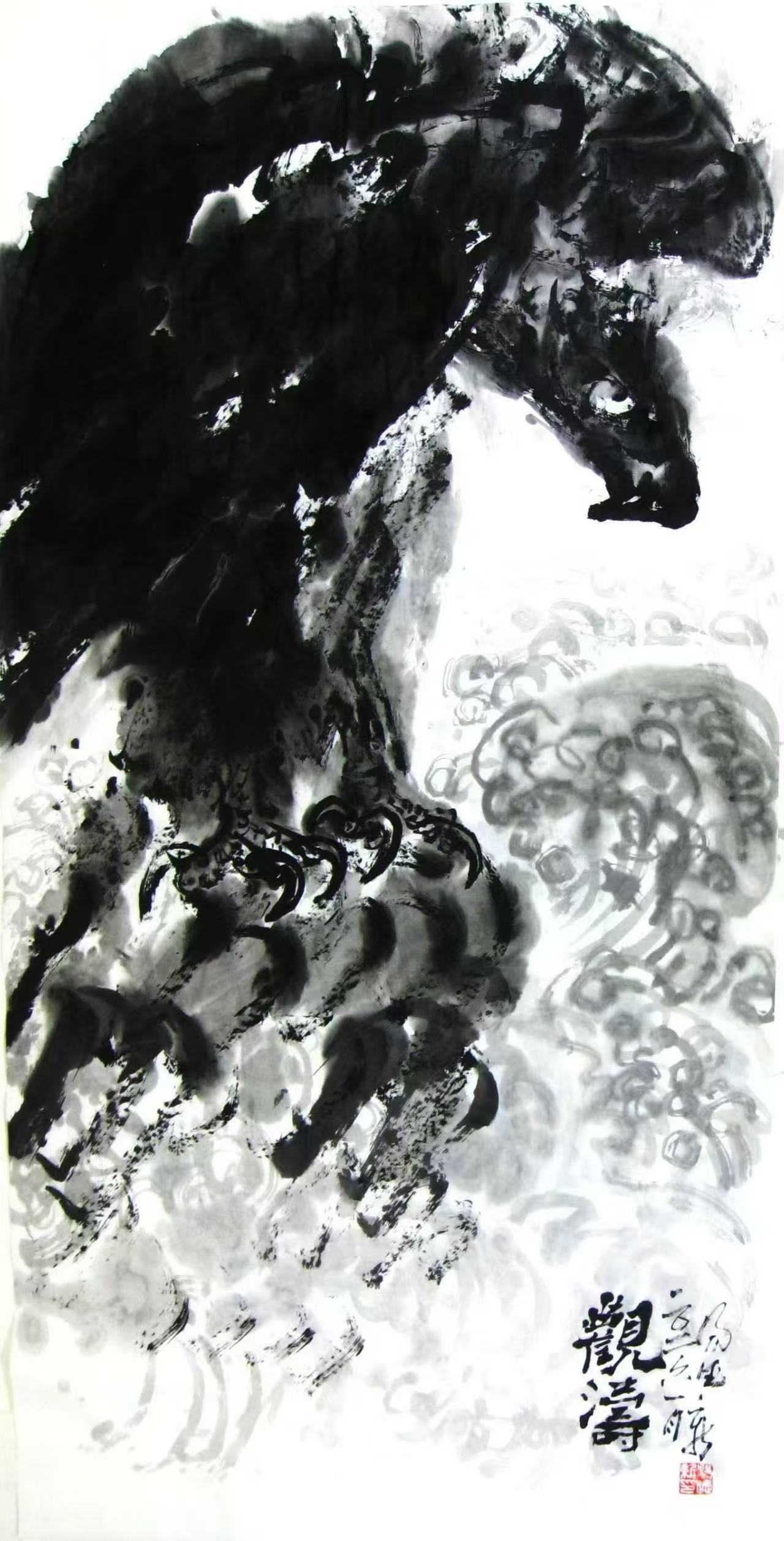 在《大风拂野》中,他以狂草的笔法绘制雄鹰的羽毛,中锋行笔时,线条如“屋漏痕”般自然流淌,沉稳而有力,勾勒出鹰羽的骨架与坚韧;侧锋行笔时,飞白笔法的运用恰到好处,线条枯涩却富有韵律,精准模拟出羽毛的蓬松质感与随风飘动的动态。整幅作品中,线条不再是简单勾勒雄鹰外形的工具,而是成为表达雄鹰精神、传递画面意境的核心元素,其韵律感与节奏感,与西方抽象表现主义绘画形成了跨文化的审美呼应。这种将书法线条转化为绘画语言的创作方式,让线条在保留传统文化底蕴的同时,获得了现代的抽象审美价值,实现了传统线条的当代转型。