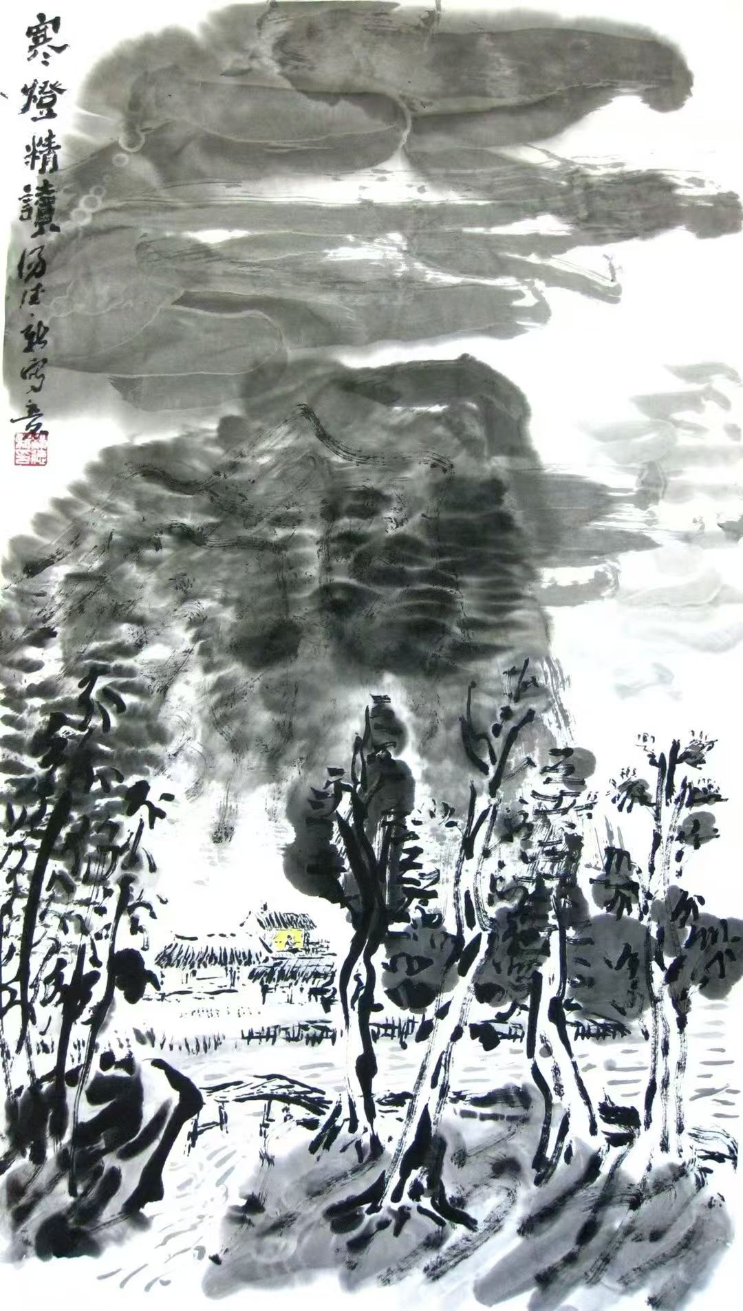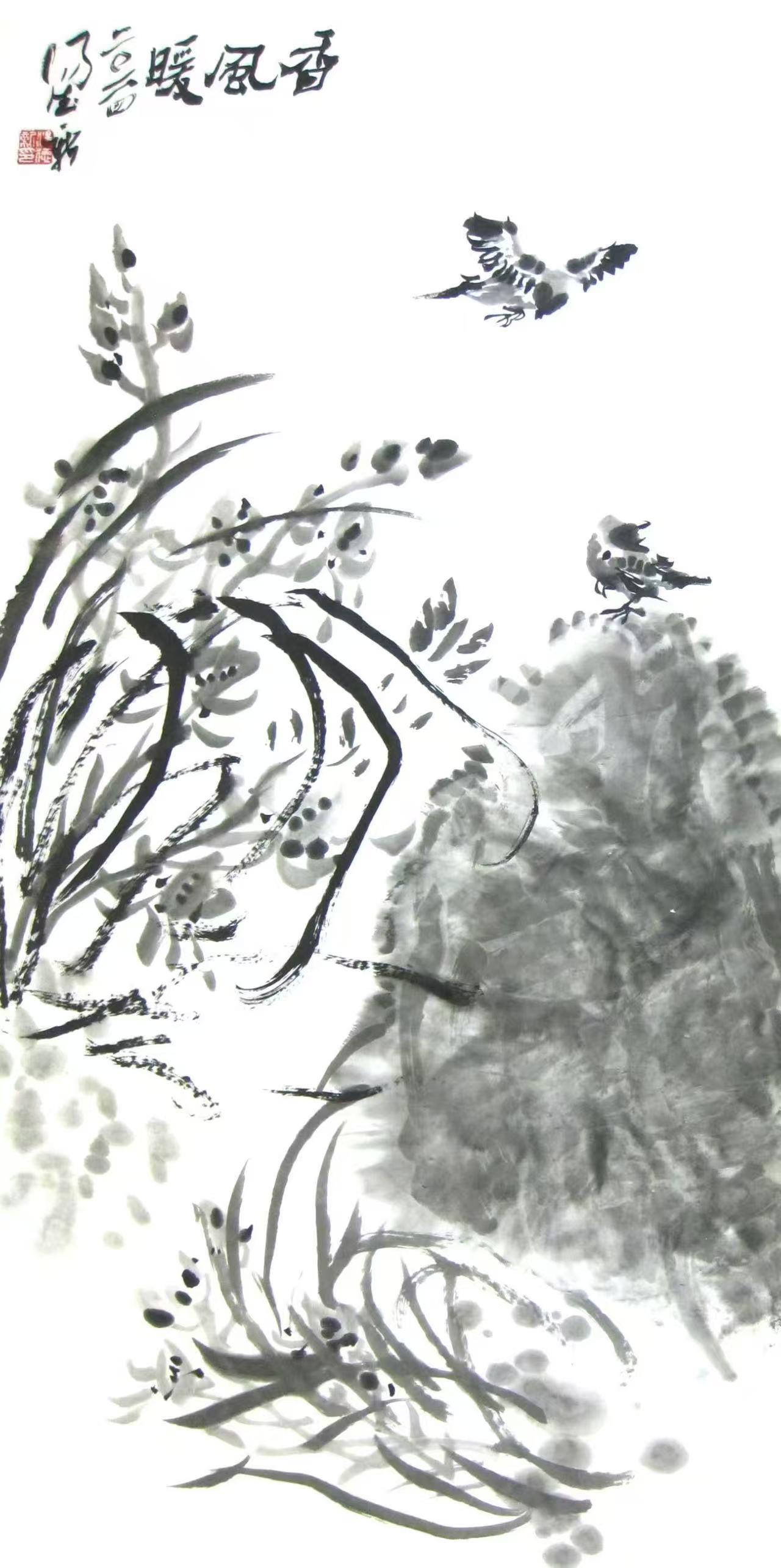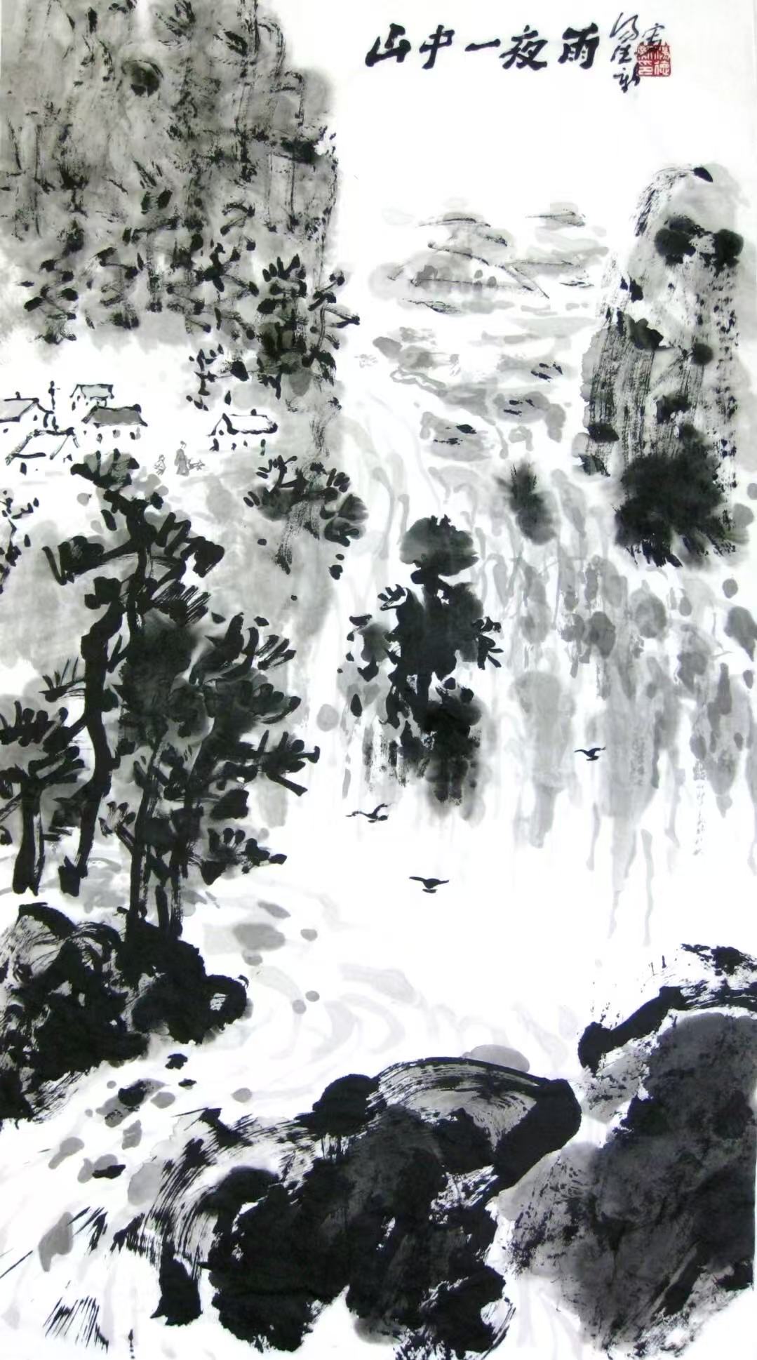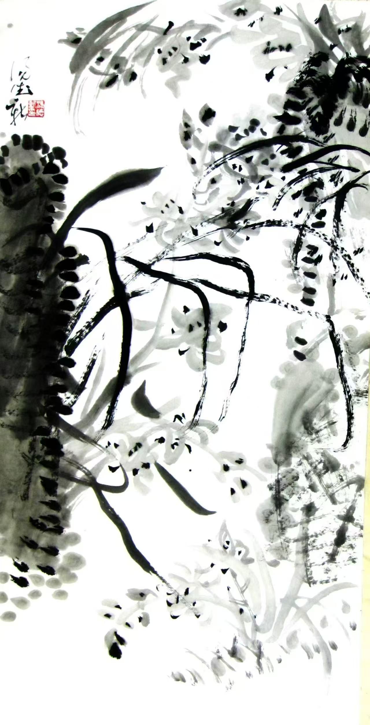 整幅作品中,淡墨的“灰”、浓墨的“黑”与宣纸的“白”相互映衬,形成了类似音乐中强弱起伏的节奏变化,淡墨区域如乐曲中的休止符,为浓墨线条的表达留出了足够的呼吸空间,让画面不再是静止的视觉呈现,而是充满动态韵律的艺术表达,墨色的层次变化成为塑造空间、营造氛围的重要手段。